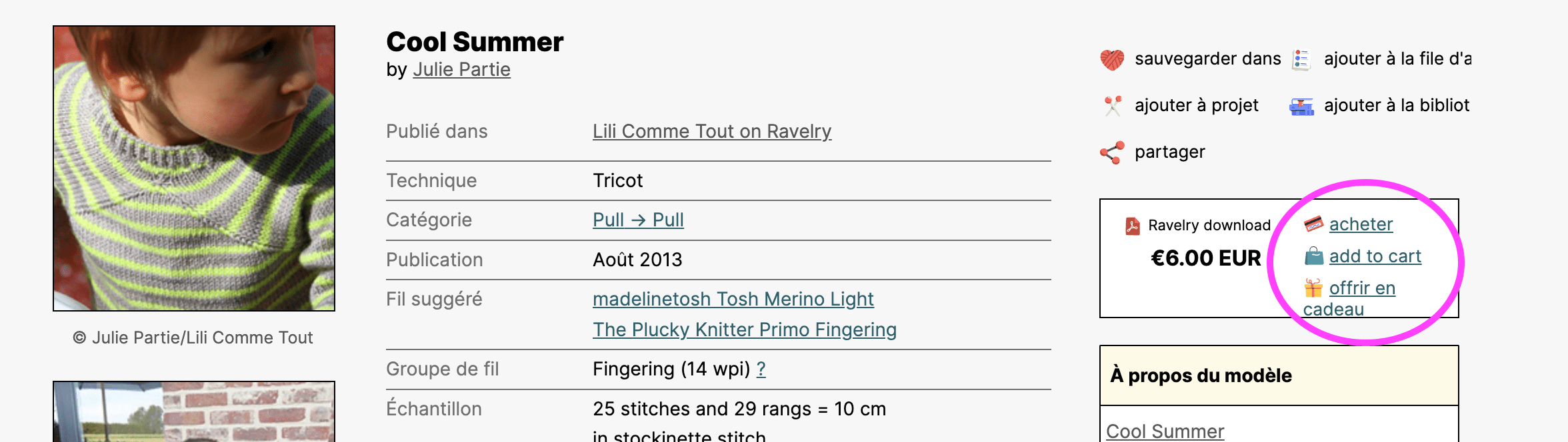 Si vous aimez le tricot (c’est sûrement le cas si vous êtes ici), Ravelry c’est quand même plus fun avec un compte. Vous pourrez si vous êtes inscrit(e), en plus du simple achat de patron comme expliqué plus haut, profiter des toutes les fonctionnalités axées sur la communauté. Vous pourrez une fois que vous avez acheté un patron, le glisser dans votre bibliothèque. Vous y aurez ainsi accès partout tout le temps, même si vous avez oublié votre patron.