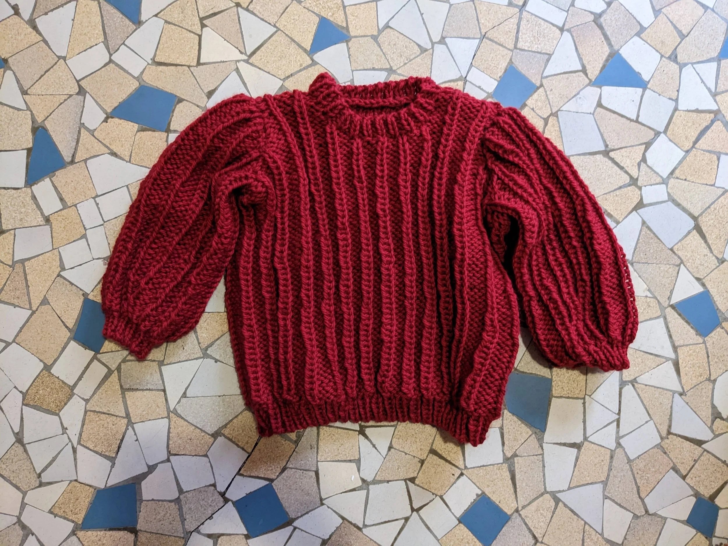 Avant cela je n’ai pas encore eu le temps de vous le montrer ici car il s’est tricoté trop vite, j’ai fait un très gros pull en MaxiWool d’Erika Knight et là aussi je suis revenue à un modèle que j’ai déjà tricoté (décidément je fais tout en double en ce moment). J’ai fait cet été un t-shirt en Pernelle de Natissea (au passage j’en profite : j’ai besoin de testeuses ! Ça se passe ici si ça vous intéresse) que j’ai beaucoup aimé tricoter. Je me suis dit que ce serait marrant de le refaire en gros fil, version pull, et voilà.