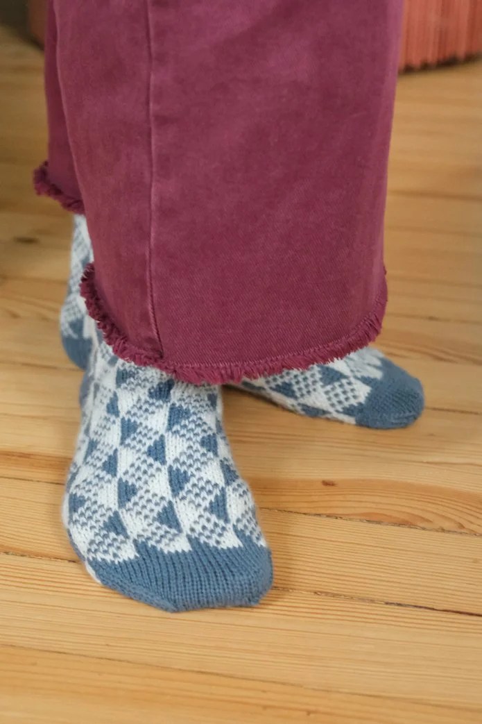 Ces chaussettes ornées d’un motif traditionnel norvégien se tricotent de la cheville à la pointe. Je me suis fait violence (mes mains ont du mal avec les toutes petites aiguilles) et je les ai tricotées avec mes Shorties de Chiaogoo histoire de ne pas m’embêter avec du Magic-loop et du jacquard et je ne le regrette pas car ça c’est finalement si bien passé que j’ai tricoté une seconde paire quelques semaines après.
