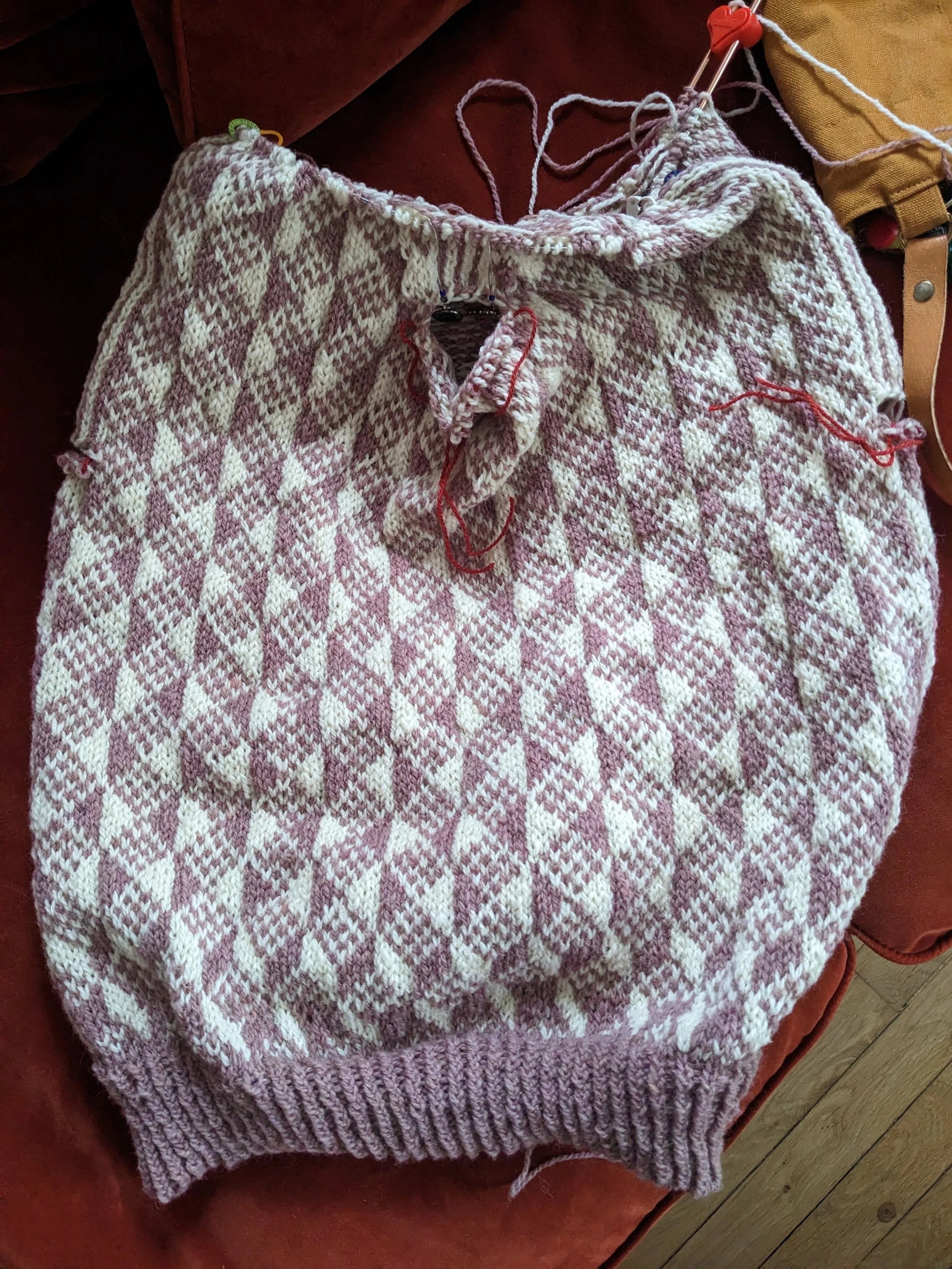 J’ai vraiment bien aimé tricoter ce motif, au point qu’il y a une dizaine de jours j’ai décidé de me tricoter un pull avec son équivalent des îles Gotland. J’ai dû tellement aimer le premier que je viens de me rendre compte, alors que j’en suis presque aux épaules qu’après 2 répétition du motif Gotland, je suis revenue au motif Norvège… oups… Je me tâte encore, est-ce que je défais ou est-ce que je décrète que c’est le charme du fait main ? Ou alors je coupe le bas et je repars dans l’autre sens ? Je vais y réfléchir… J’utilise en tous cas le Lambswool de Biches et Bûches avec lequel je me régale.