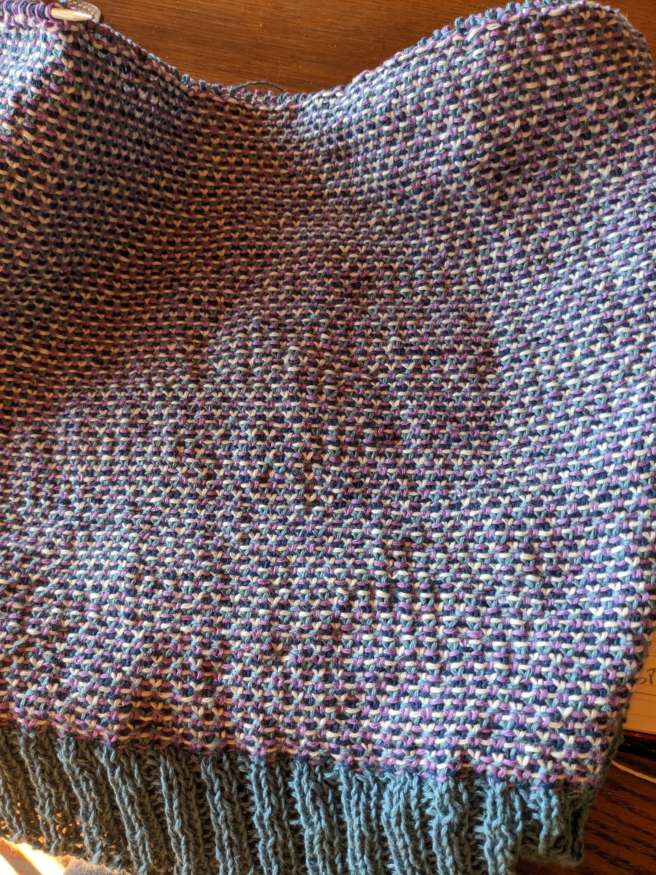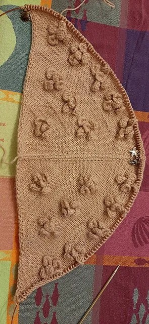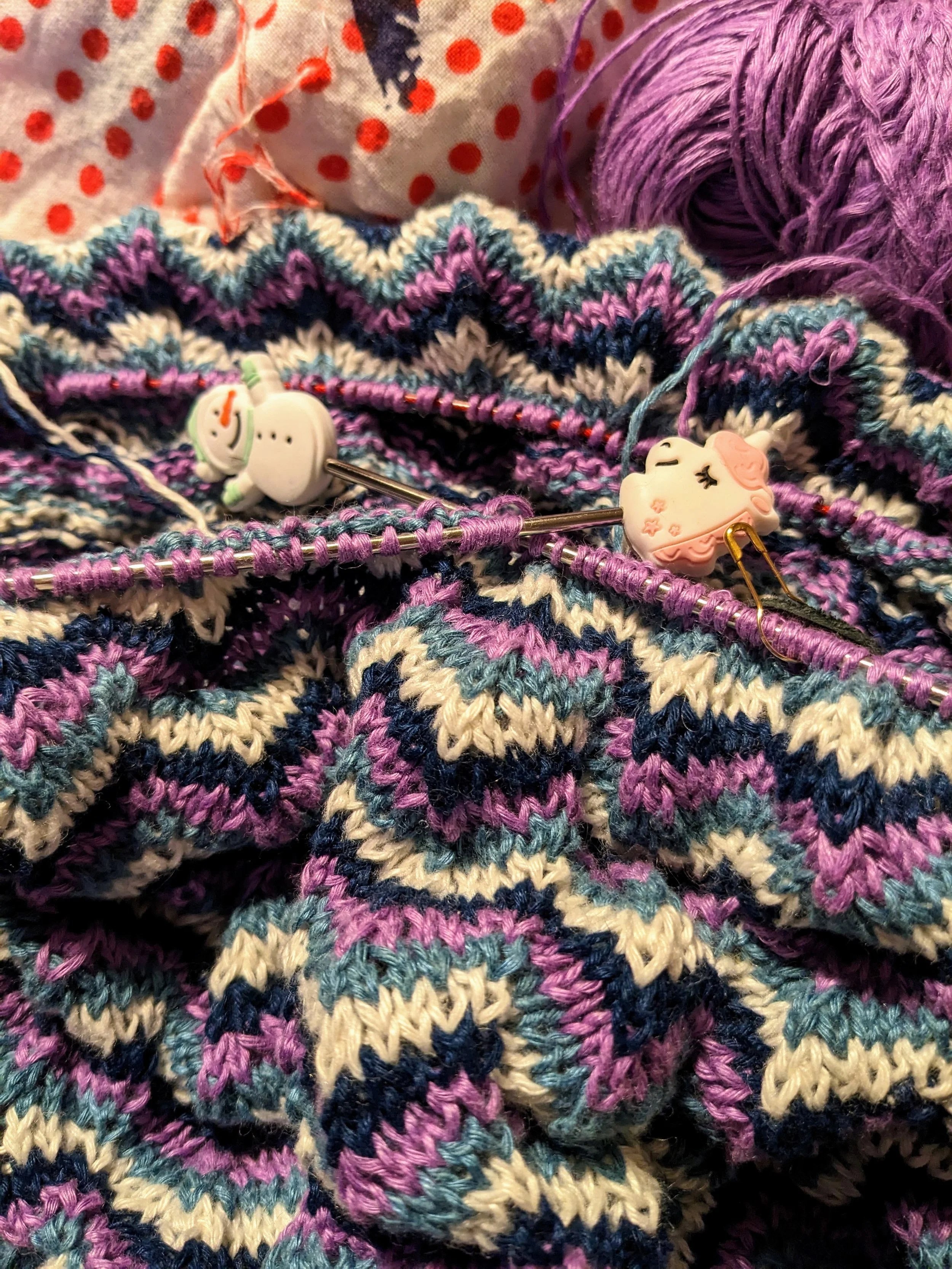 C’est encore une fois mon étourderie qui est responsable du problème : je me suis lancée tête baissée dans ce motif au cours duquel je dois changer de couleur à chaque tour. En rond, tout se passe bien. Arrivée aux dessous de bras, au moment de devoir tricoter à plat pour séparer devant et dos, je me suis rendue compte que le fil se retrouverait toujours en fin de rang… à moins de le couper après chaque rang, impossible de le faire passer discrètement. Sachant qu’en mailles glissées mon échantillon était de 48 rangs pour 10 cm que j’avais calculé 76 rangs à partir des dessous de bras, qu’il y avait un dos et 2 devants pour le décolleté, me voilà rendue à 456 bouts de fils à rentrer, ouille. J’ai donc détricoté gaiement pour repartir aux côtes et me rabattre sur un zig zag super 70s qui va bien me plaire aussi.