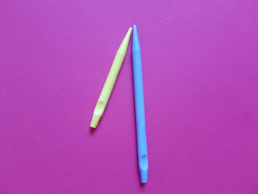 Il existe 2 types de pointes : les longues et les courtes pour les manches ou les bonnets, qui ont la particularité d’avoir des bouts plus pointus. On n’est pas du tout sur le même produit que les autres, mais moi je les aime beaucoup. Je ne sais pas si c’est de la nostalgie, mais je les trouve légères, elles sont certes en plastique mais le plastique est de grande qualité. J’ai Magic-loopé avec, ce n’est pas la matériel idéal pour cette technique mais ça se fait. C’est également celles que j’utilise en avion, puisqu’elles sont homologuées pour passer les contrôles.