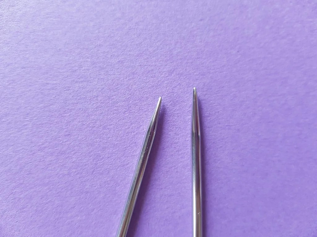 Deux aiguilles HiyaHiya de 3,75 mm. À gauche une Sharp, à droite une pas Sharp. Ce n’est pas flagrant à l’oeil nu mais vos doigts s’en souviennent.