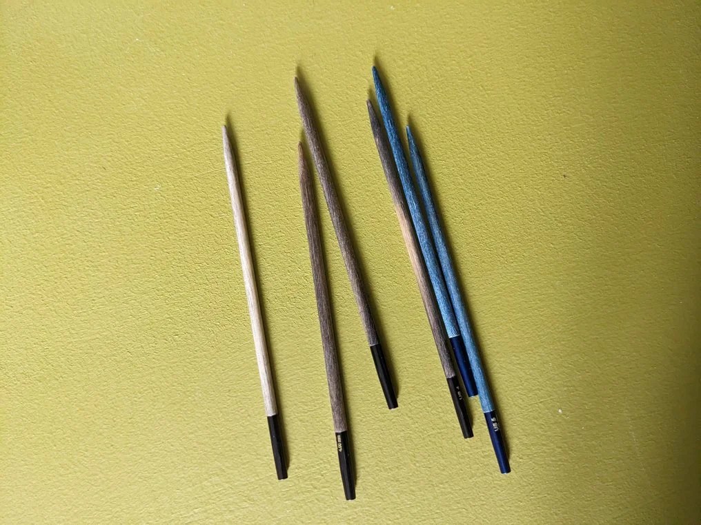 Je trouve le bois très agréable, elles sont très légères ce qui convient bien à mes soucis de main. On a le toucher doux du bois légèrement vernis et le super câble qui tourne HiyaHiya. Je les ai aussi essayées en fixes, elles sont très bien mais je trouve dommage de se priver des câbles tournants (cette fonctionnalité ne se fait que pour les interchangeables) quand on acquiert des aiguilles de cette marque.