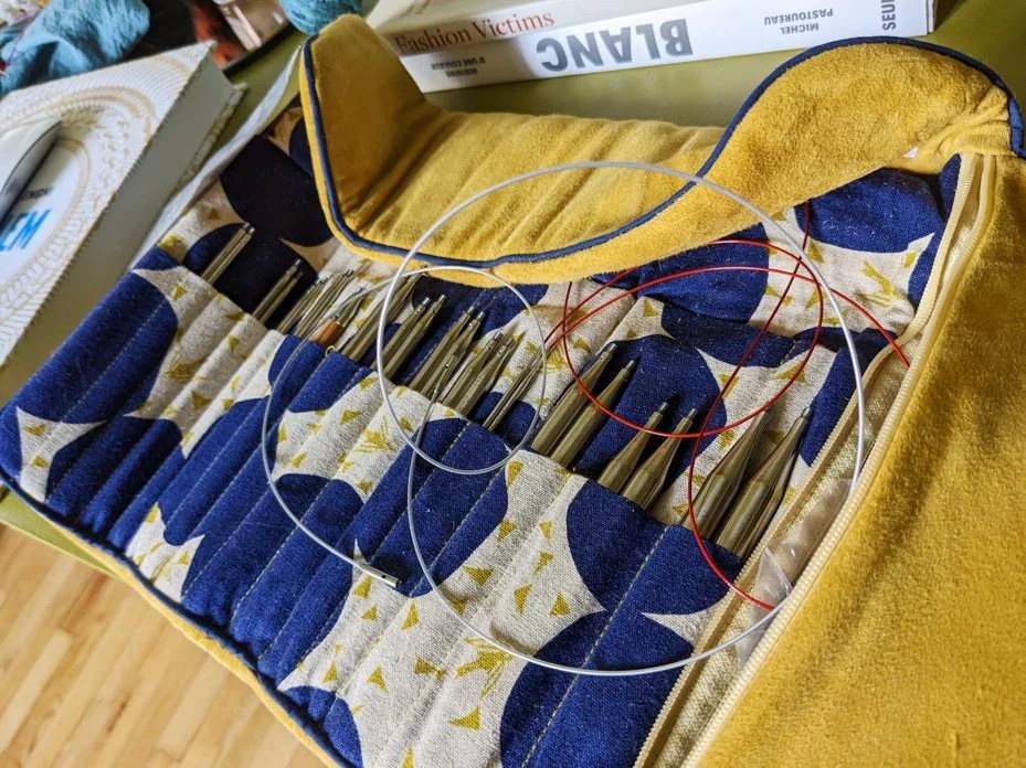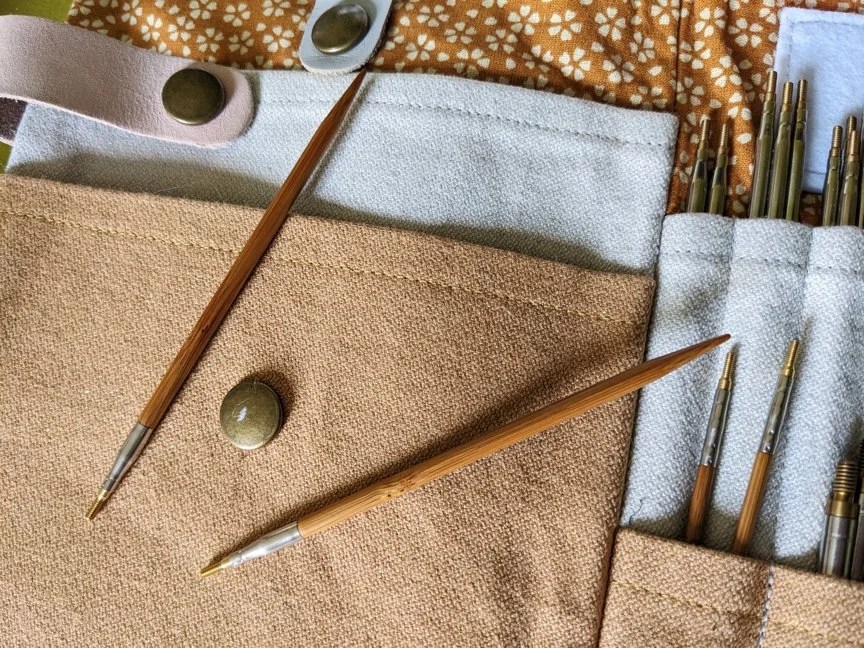 Il faut aimer, elles sont assez lourdes, la sensation du cuivre sur les doigts c’est spécial, elles font sentir les mains et elles se patinent. Je trouve personnellement toutes ces caractéristiques assez sensuelles, le tricot c’est en grande partie du toucher. Et je suis ravie car comme pour certaines aiguilles vues plus haut, le câble tourne dans l’aiguille. Je me suis offert le kit en pointes longues, il existe aussi avec les pointes plus courtes. J’ai juste une remarque négative, puisqu’on parle du sens du toucher : vous les voyez ici dans une formidable pochette Le Lièvre Blanc qui n’est pas leur emballage d’origine. L’espèce de pochette en imitation suède « vegan » (une façon polie de dire « synthétique ») noire a fini à la poubelle, elle me faisait une vilaine sensation sur les doigts. Ça ne gâche en rien mon plaisir de tricoter avec mais c’est toujours sympa et ça fait partie de l’expérience quand la pochette est canon.