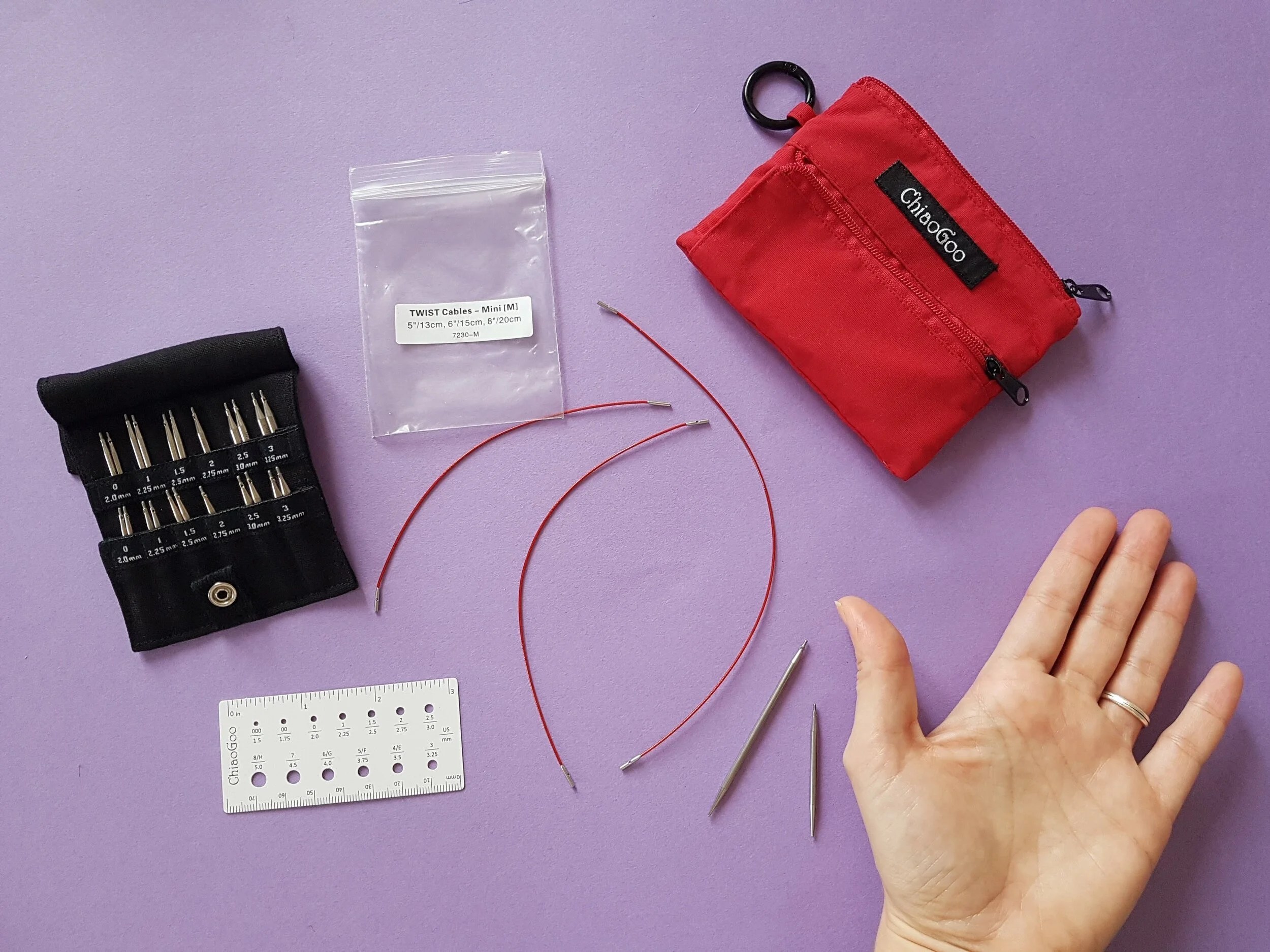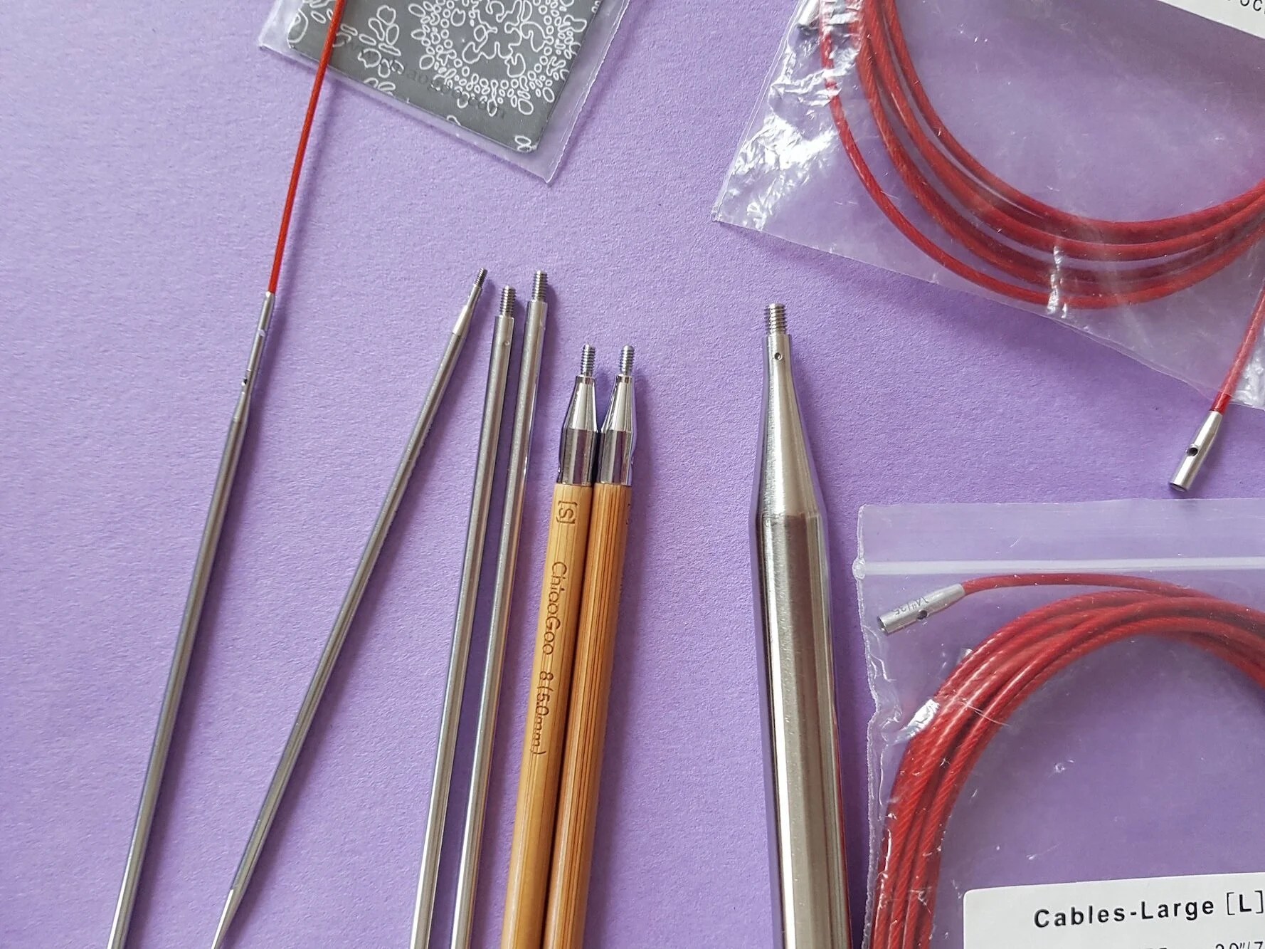 Tout ça s’achète au détail, dans la mercerie on dit « bonjour je voudrais un câble Chiaogoo de 60 cm s’il vous plaît », et le mercier ou la mercière vous sort un petit sachet qui contient juste un câble. On peut aussi juste acheter des pointes si on a déjà le câble à la maison.