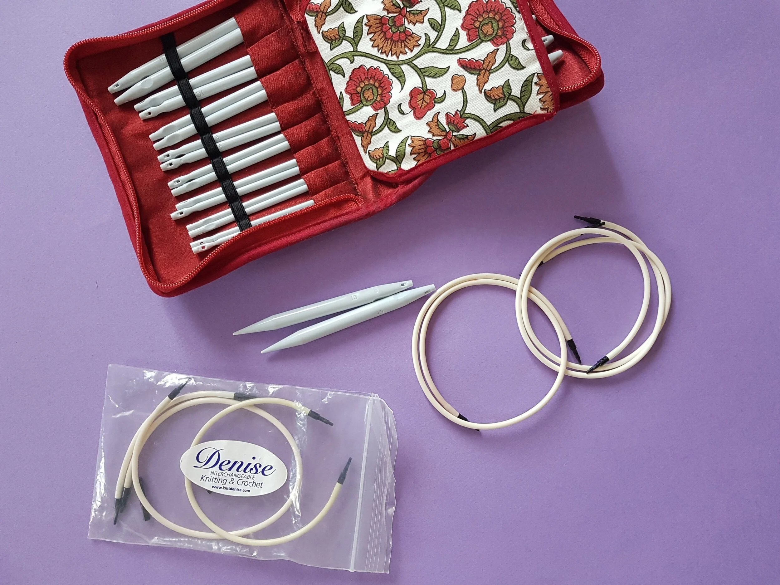 Les aiguilles sont en plastique, et les câbles sont assez épais et beaucoup moins souples que sur les marques précédentes. Ils sont toutefois à mémoire de forme ce que je trouve très agréable. Ils se clipsent dans les pointes, et elles commencent au 3,75 mm. Denise est une marque américaine, et tout est fabriqué aux États-Unis. Je crois que ce sont les premiers à avoir commercialisé des aiguilles interchangeables.