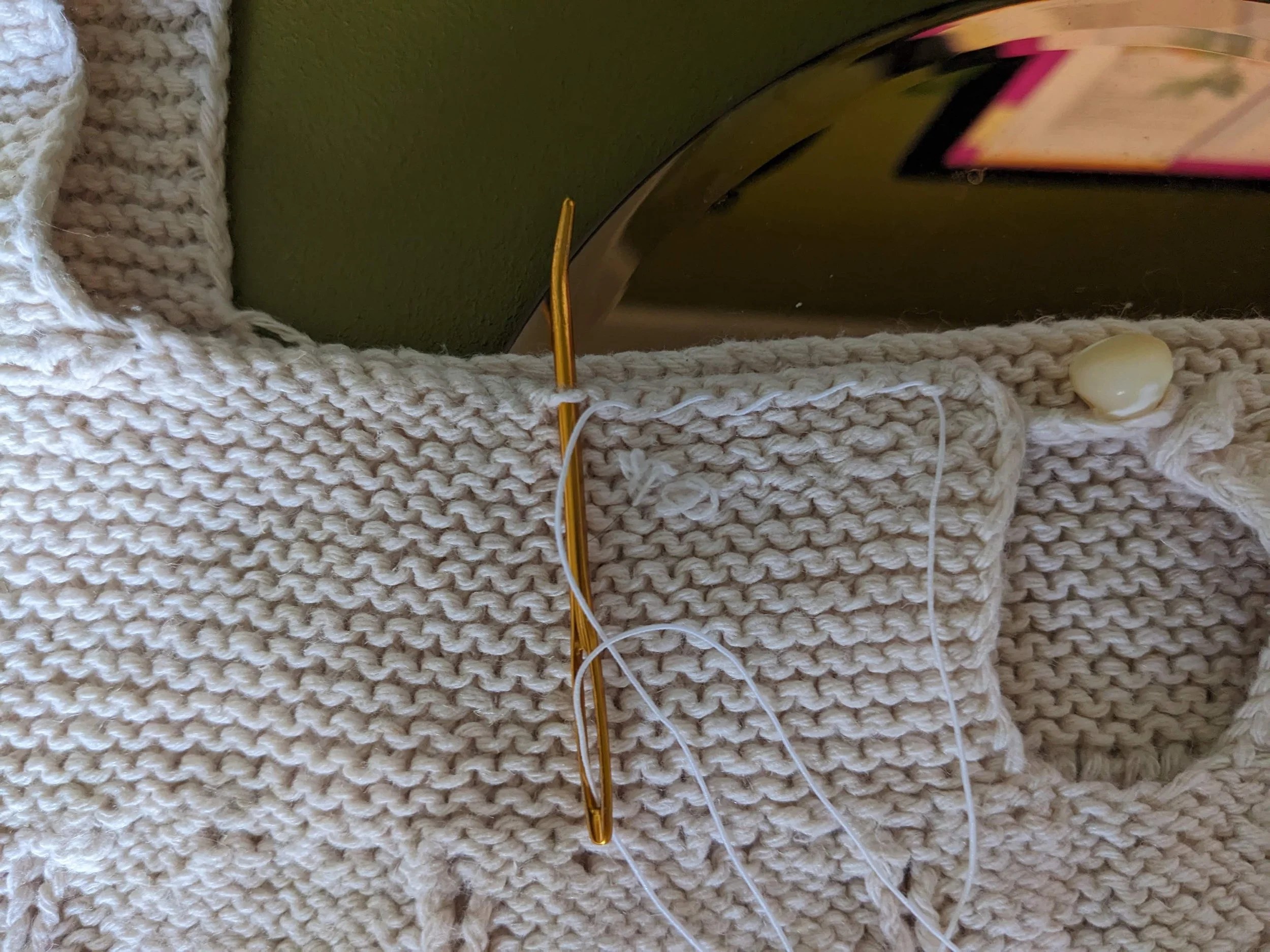 C’est une astuce que j’utilise aussi pour certains cols et poignets que je souhaite bien serrés si mon tricot se détend au fil du temps ou tout simplement si je veux un effet très étroit tout en passant quand même la main ou la tête. Près du bord, sur l’intérieur du vêtement, je glisse l’élastique à l’aide d’une aiguille à tapisserie à peu près toutes les 2 mailles.