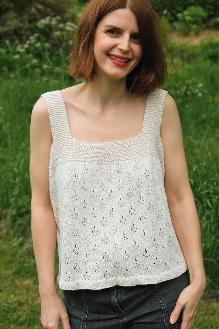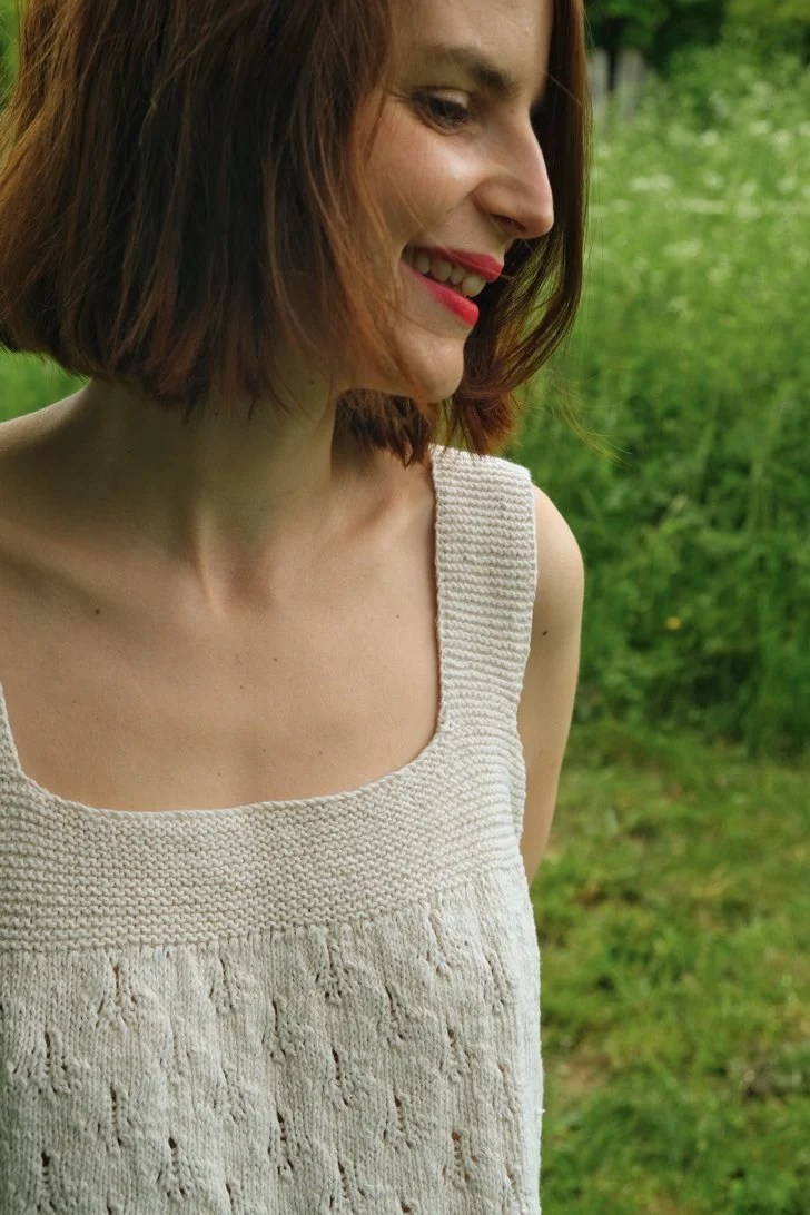 Il se tricote en top-down : on commence par tricoter les deux bretelles au point mousse. On monte ensuite les mailles de la bande de poitrine tout en intégrant les bretelles préalablement tricotées. On augmente avant de commencer la dentelle pour bien faire blouser l’ouvrage, puis on commence le point de dentelle jusqu’en bas de l’ouvrage.