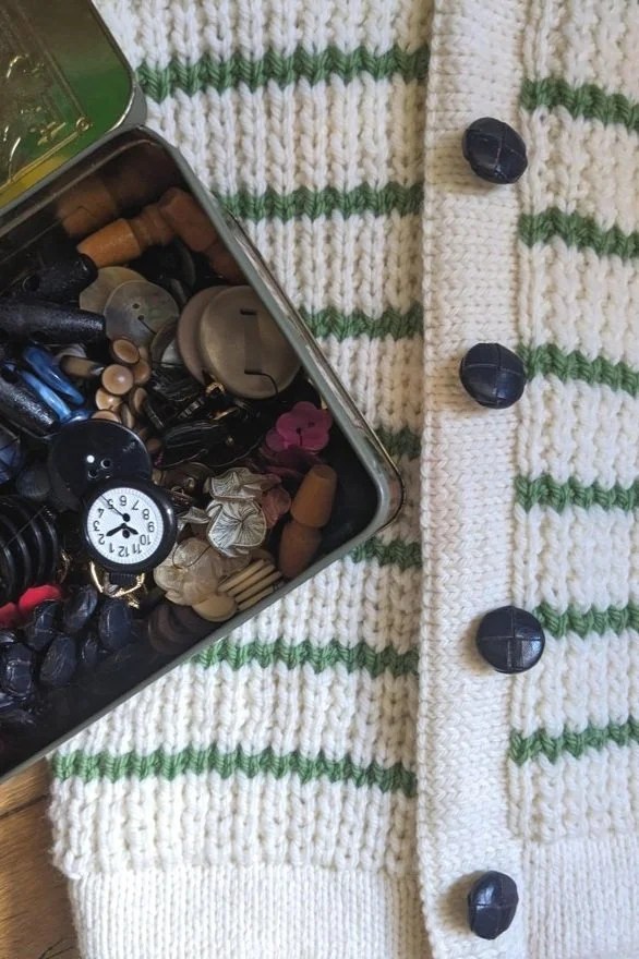 Ma veste sans manches a presque toutes ses bordures, le moment crucial du choix des boutons va bientôt arriver. J’ai prévu de calculer et rédiger le patron dans les jours qui viennent, attendez-vous donc à cette autre proposition de test la semaine prochaine.