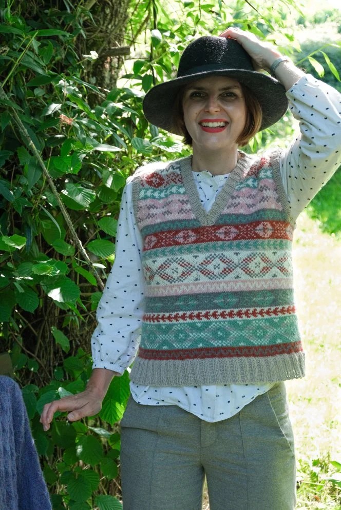 On commence le tricot par le bas, on le réalise tout en rond car emmanchure et encolures sont ouvertes par un steek. Pour celles et ceux qui ne connaitraient pas cette méthode qui évite de tricoter le jacquard sur lâenvers, jâavais fait un article dessus consultable ici. Le pas à pas en image est également imprimé dans la partie technique du catalogue. Une fois le steek coupé on relève des mailles autour des emmanchures et de lâencolure pour tricoter les bords-côtes. Jâai hâte de voir quelle combinaison de couleurs vous choisirez !