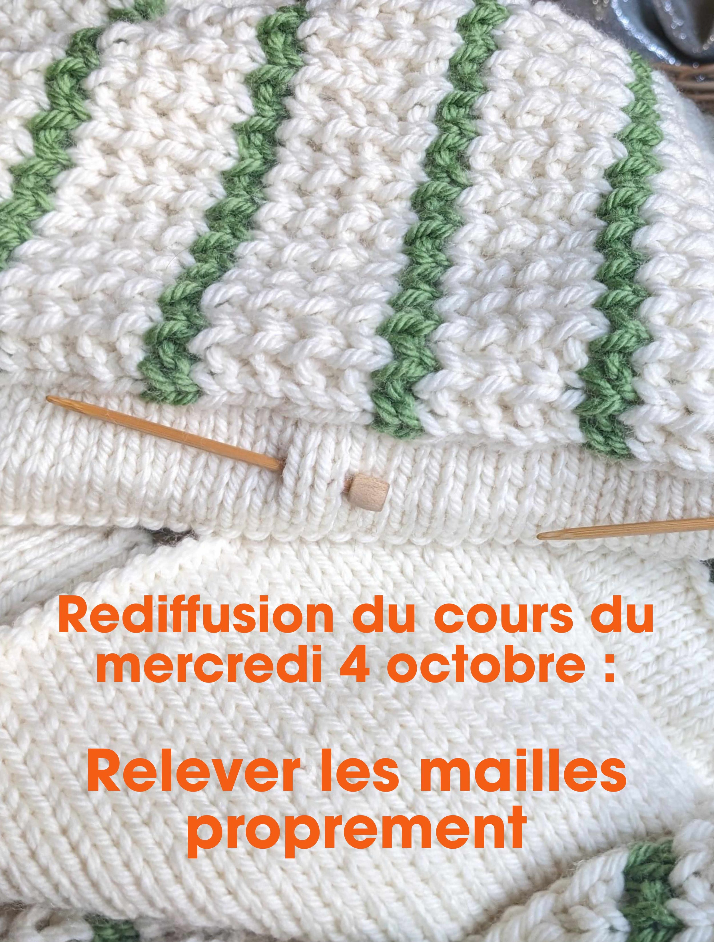 Mercredi soir nous avons eu le cours de relevage de mailles que j’ai exporté, monté et mis en ligne vendredi. Les participantes ont choisi le prochain thème qui sera donc le point brioche (c’est l’autre nom de la côte anglaise) et qui est prévu pour le mardi 17 octobre 21H, à vos agendas. Pour le moment on est plus sur un cours toutes les 2 semaines plutôt que tous les mois mais c’est un vrai plaisir pour moi de passer ces moments avec vous ! Je prendrai un peu de vacances durant la Toussaint avec une pause cours de 2 semaines.