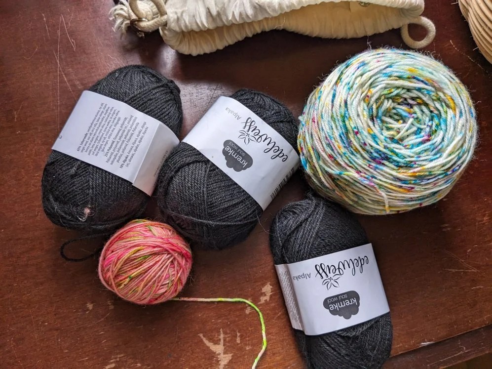 Si je dois être tout à fait honnête, je suis quand même sortie faire un tour samedi (je devais aller chez le cordonnier) et j’en ai profité pour acheter du fil à chaussettes noir pour me tricoter les chaussettes assorties au pull. J’ai du moucheté bleu offert par Juliette et du moucheté rose offert par Anne, ils feront de parfaits coloris contrastants dans l’esprit du pull… Je suis sage, je n’ai pas monté ce projet, je dois terminer ma manche et mon châle d’abord, après on verra…