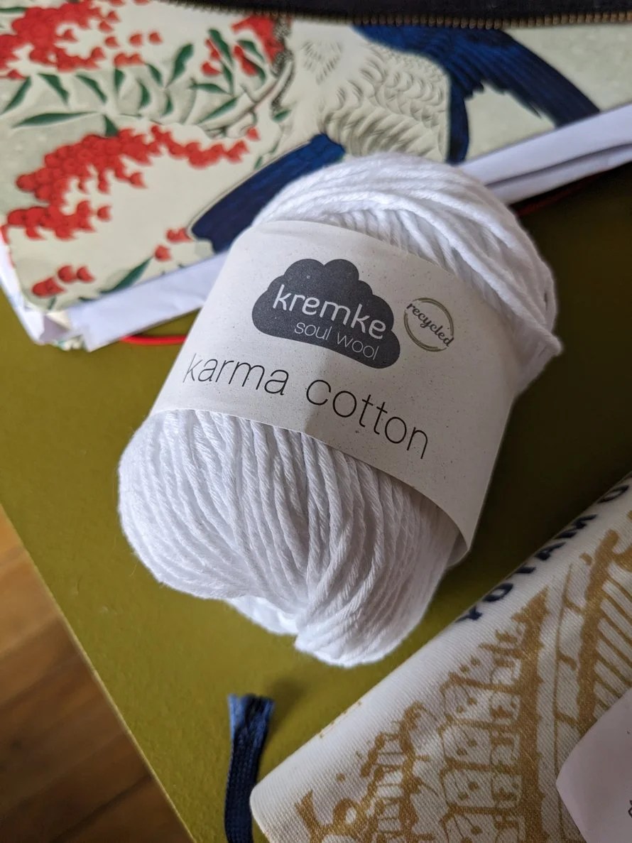 Le Karma cotton est vraiment sympa, je vais pouvoir proposer un kit très très peu cher. Je crois que la pelote est à 3,20€ car le fil est composé de 70% de coton recyclé et 30% de PET (de la bouteille plastique) recyclée. Kremke propose pas mal de fils recyclés qui ne m’ont jamais déçu.