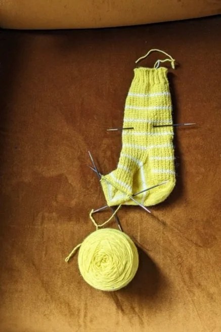 J’ai assez peu tricoté comme je suis en attente de fil mais j’ai un tout petit peu avancé la chaussette d’Arnaud. Plus qu’une et demie et on est bon !