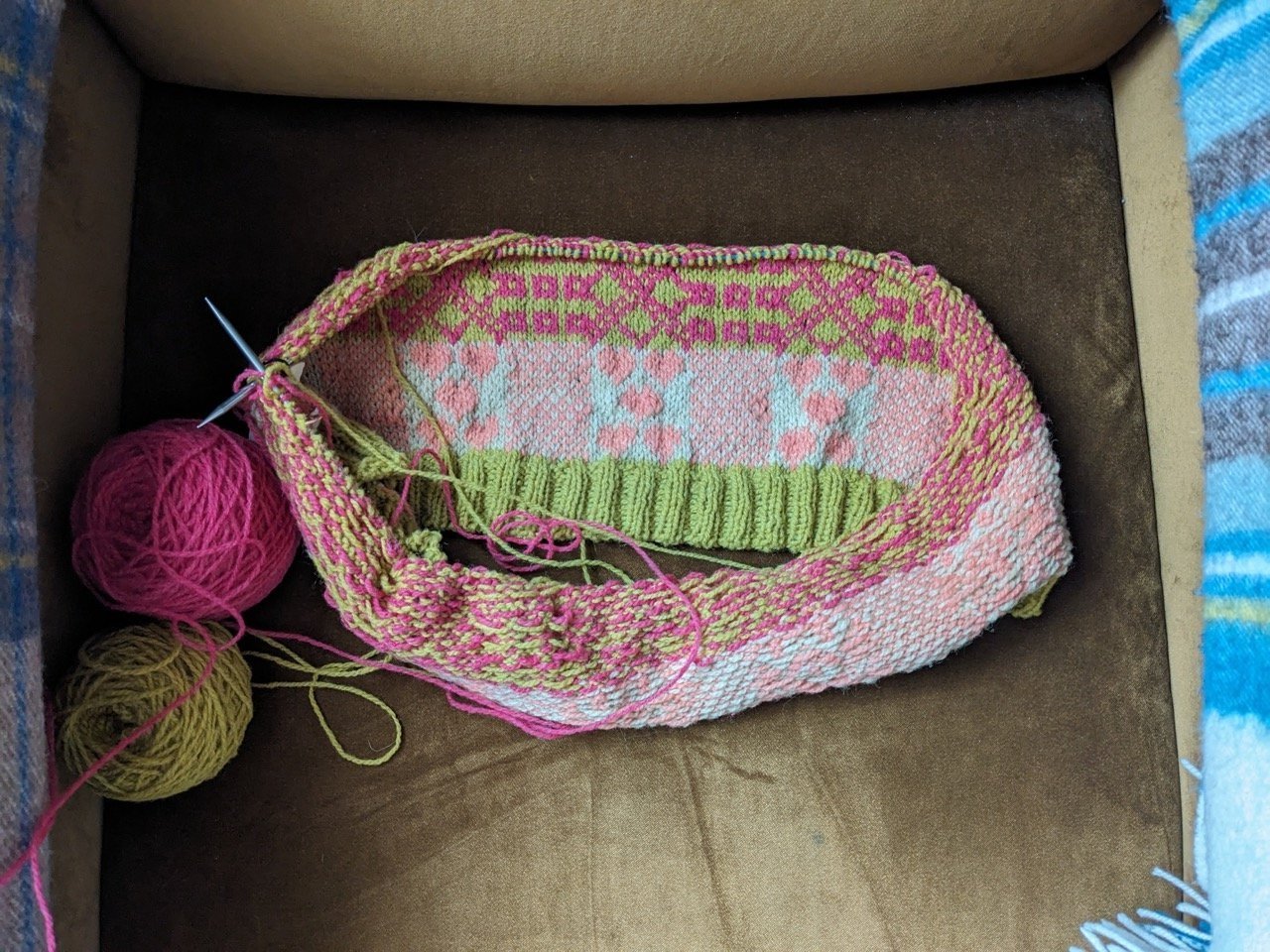 J’ai commencé mon cardigan en Fabrique Povéda, j’ai tellement besoin de bonne humeur que c’est ce qu’on appelle un lâchage total tant en couleurs qu’en motifs. Tricoter du jacquard me fait beaucoup de bien, je compte dans ma tête et ça a un effet méditatif apaisant. Je me suis lancée dans une ambiance un peu patchwork, avec des motifs inspirés du folk américain. Pour le moment je n’ai que 2 hauteurs de motifs, j’ai encore plus d’une couleur dans mon sac !