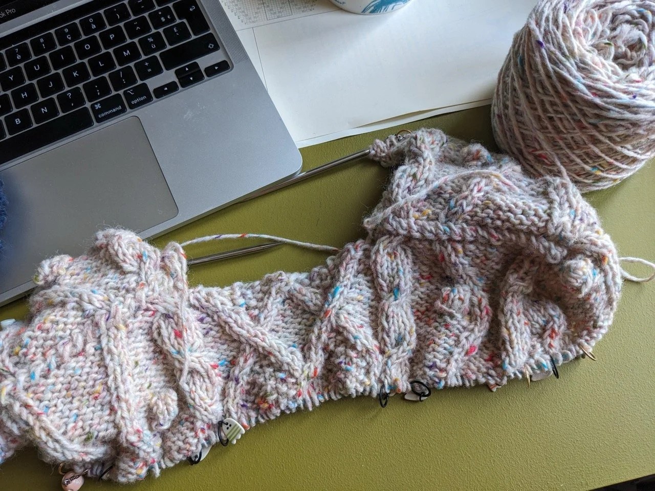 Le reste de la Pure Tweed est arrivée, j’ai repris ma veste à torsades, puis je l’ai recommencée pour changer un détail, j’en suis donc rendue à peu près au même point que la semaine dernière.