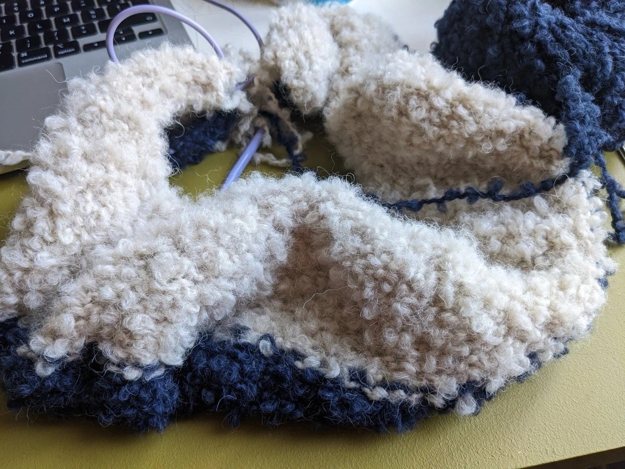 J’ai avancé tout ce que j’ai pu, en cette chaude semaine, sur ma veste en Pure Tweed et puis je suis arrivée à cours de laine (je n’avais qu’un échantillon). En attendant que la quantité nécessaire arrive j’ai monté, avec de la laine de mon placard, un nouveau projet très chaud et très poilu mais aussi très doux en Teddy Dear qui me donne l’impression de tricoter le caniche nain très mignon noir et blanc de ma voisine.