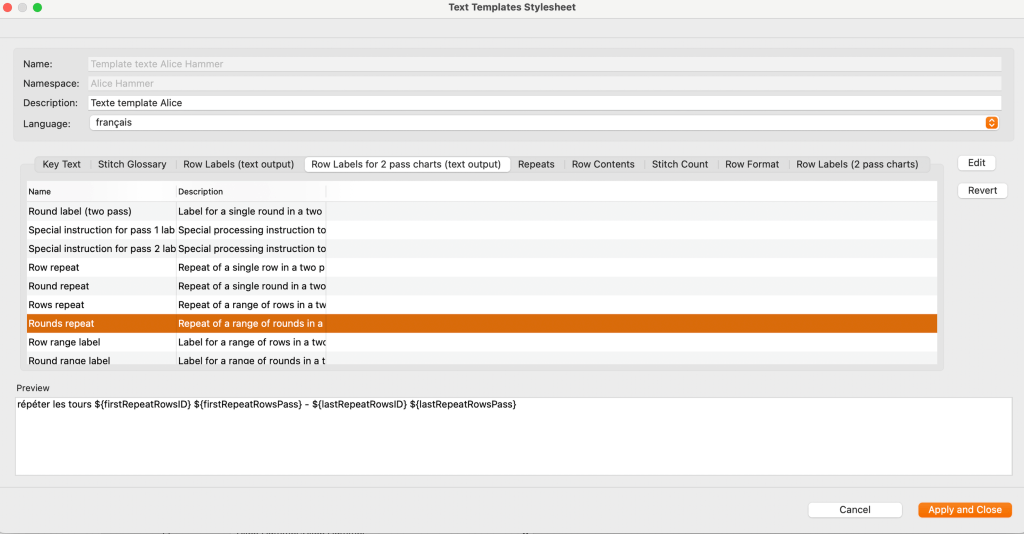 Une participante au Kal m’a confié ne pas arriver à travailler avec une grille seule et comme je ne veux laisser personne sur le bord de la route je me suis lancée dans ces fameuses explications rang par rang. C’était inenvisageable de les faire manuellement, c’est vraiment très très long « d’écrire » chaque maille d’une grille de tricot et j’avais bien entrevu que mon logiciel de grilles pouvait faire ça. J’ai donc appris à configurer plein de choses pour pouvoir générer des explications écrites depuis mon logiciel de grilles, j’ai pu créer ma propre bibliothèque de points, des tournures de phrases en français en codant un peu (c’est un logiciel américain), lui faire prendre en compte des répétitions pour qu’il nous donne même le bon compte de mailles, bref un monde s’ouvre à moi. J’ai, en 2 jours de bidouillages et recherches diverses (et un peu d’échanges de mail avec les programmatrices qui sont adorables et de bon conseil), compris plein de choses sur ce programme que j’utilise depuis 13 ans de manière très basique.