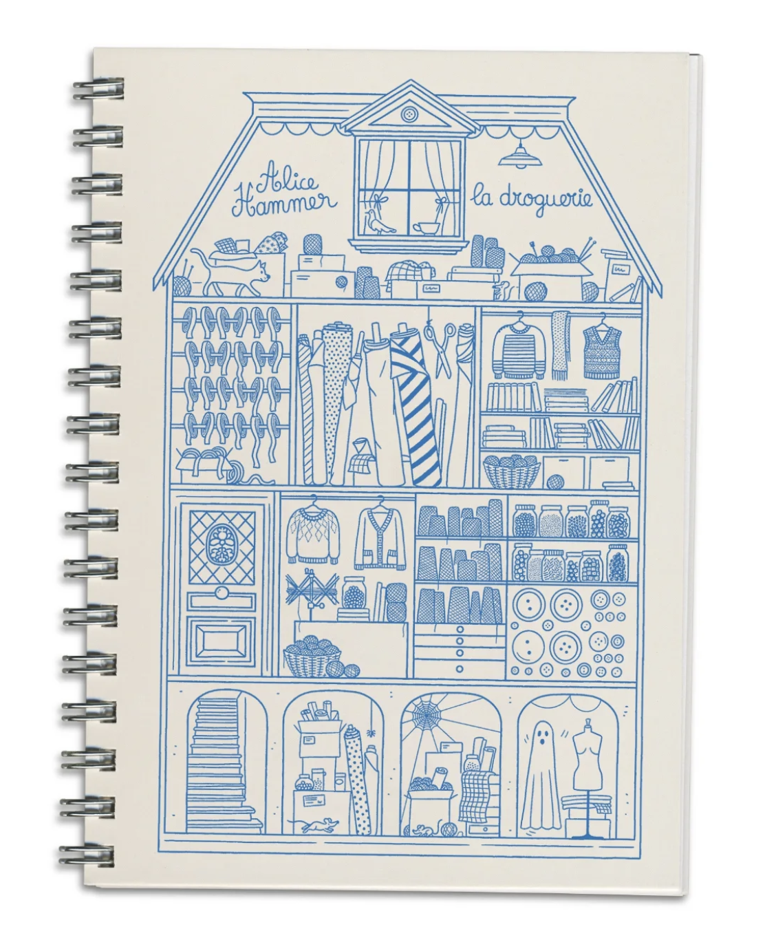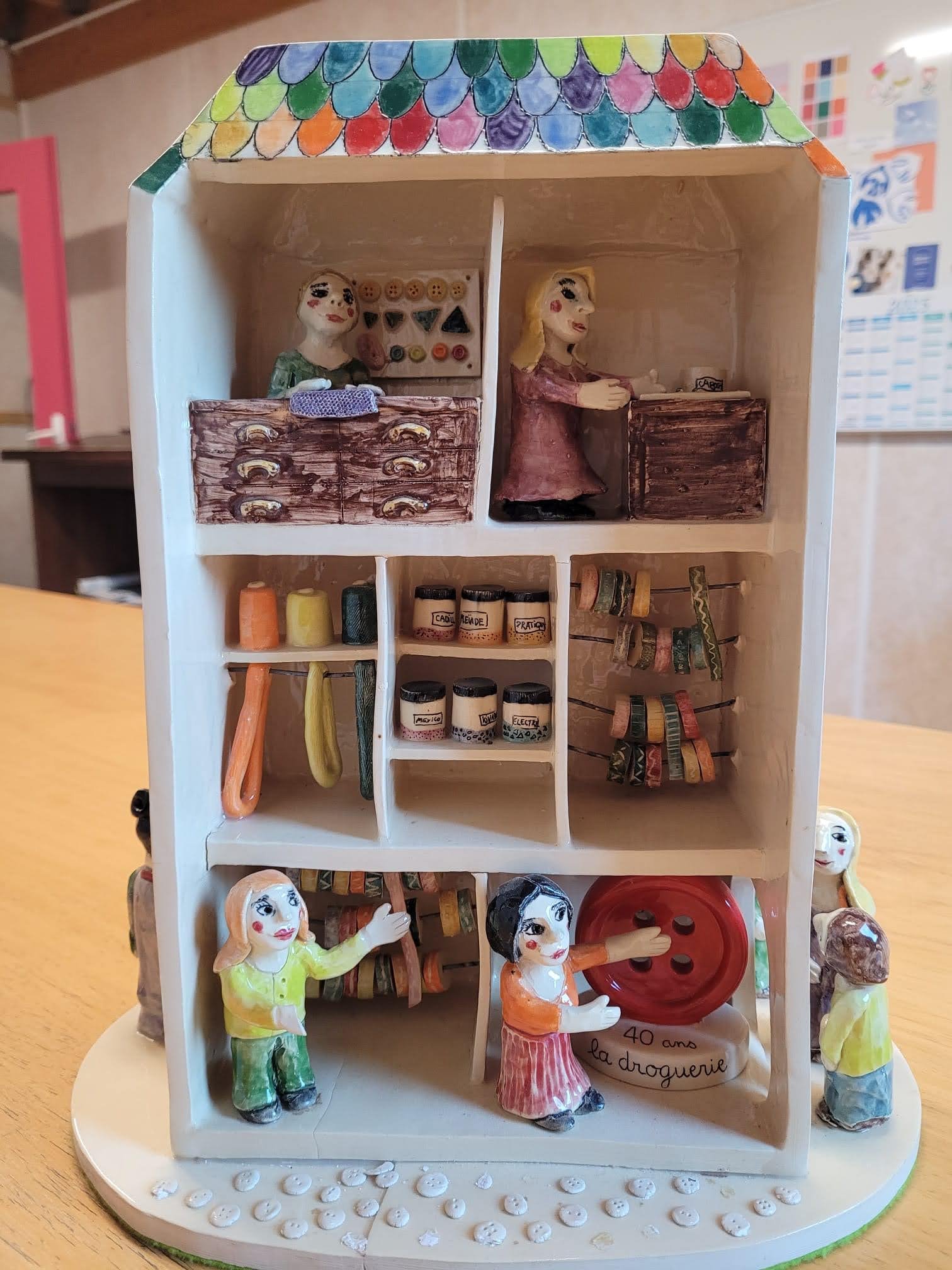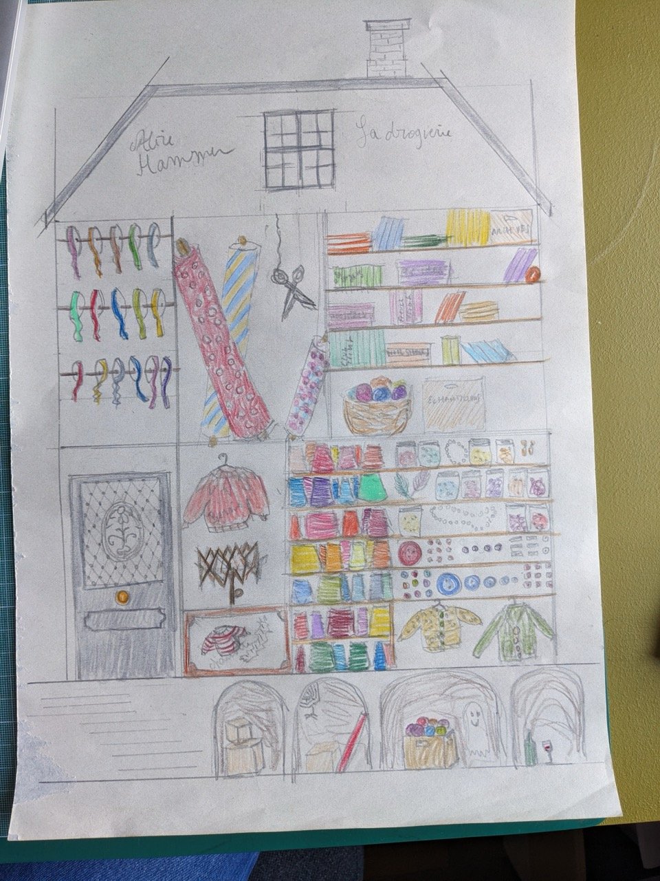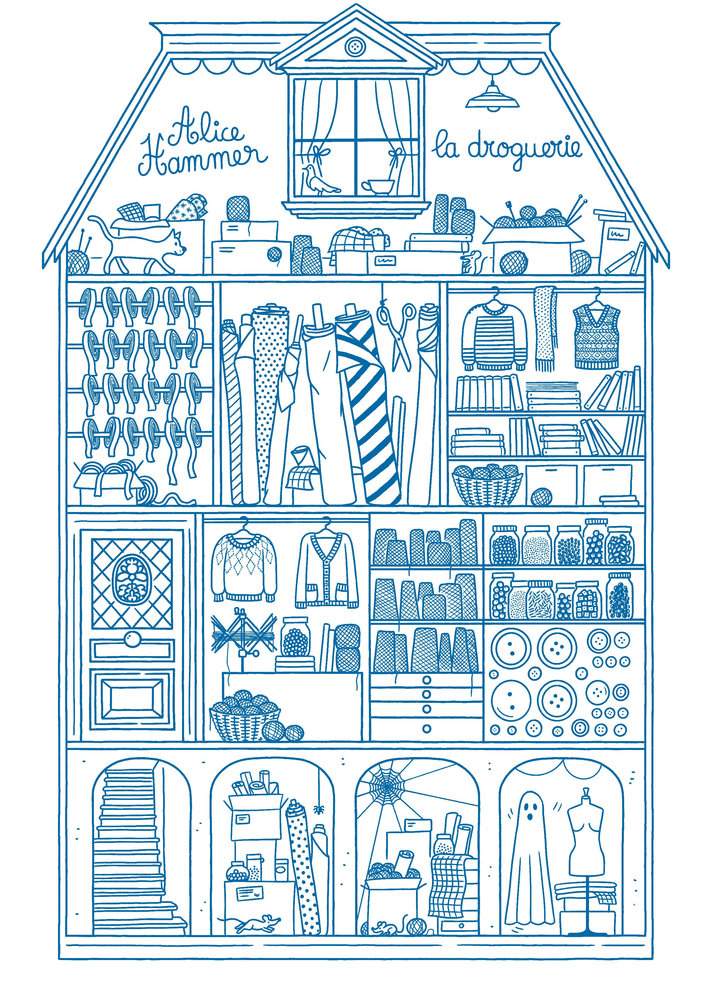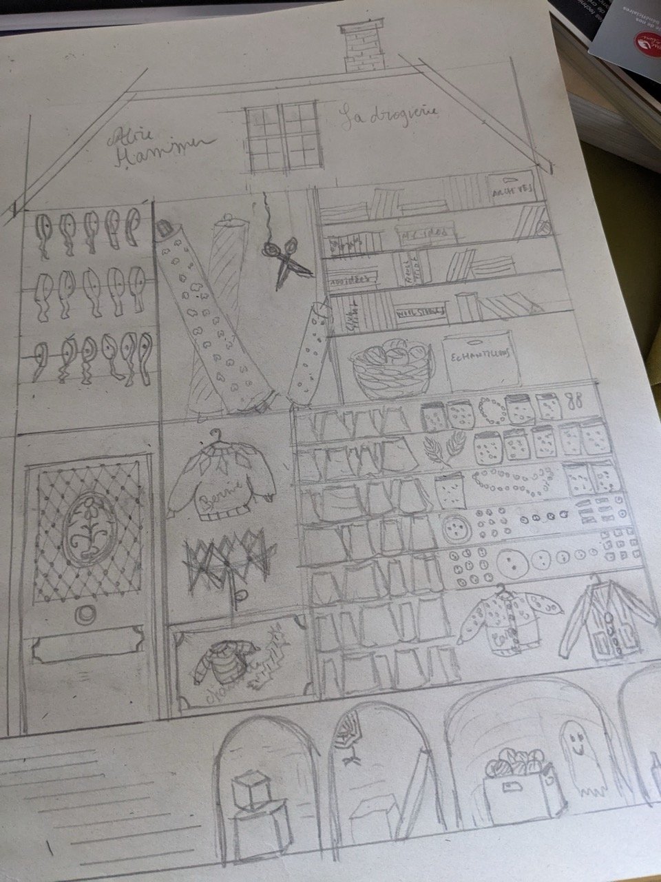 Ce fut donc un vrai travail d’équipe. J’ai retrouvé Suzie et Maëlle de La Droguerie à Paris pour tourner quelques vidéos en vue d’animer le Kal, nous en avons profité pour réfléchir ensemble à des idées de questions rigolotes à vous poser tout au long de l’évènement. Suzie a évoqué l’idée d’un plateau de jeu et m’a montré une petite boutique La Droguerie en céramique réalisée par Amandine, une ancienne Droguette de Nantes. De mon côté j’étais déjà bien emballée par l’ambiance “manoir vu en coupe” de certains plateaux de jeu vintage de Cluedo, alors en rentrant chez moi j’ai fait un croquis d’une espèce de manoir Droguerie reprenant les éléments du Kal Mystère et certaines collaborations Alice Hammer x La Droguerie du passé.