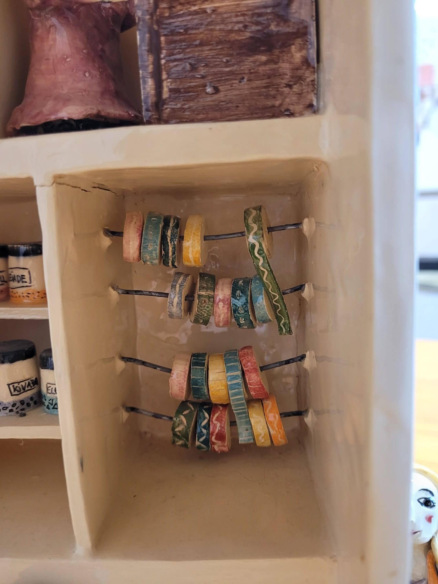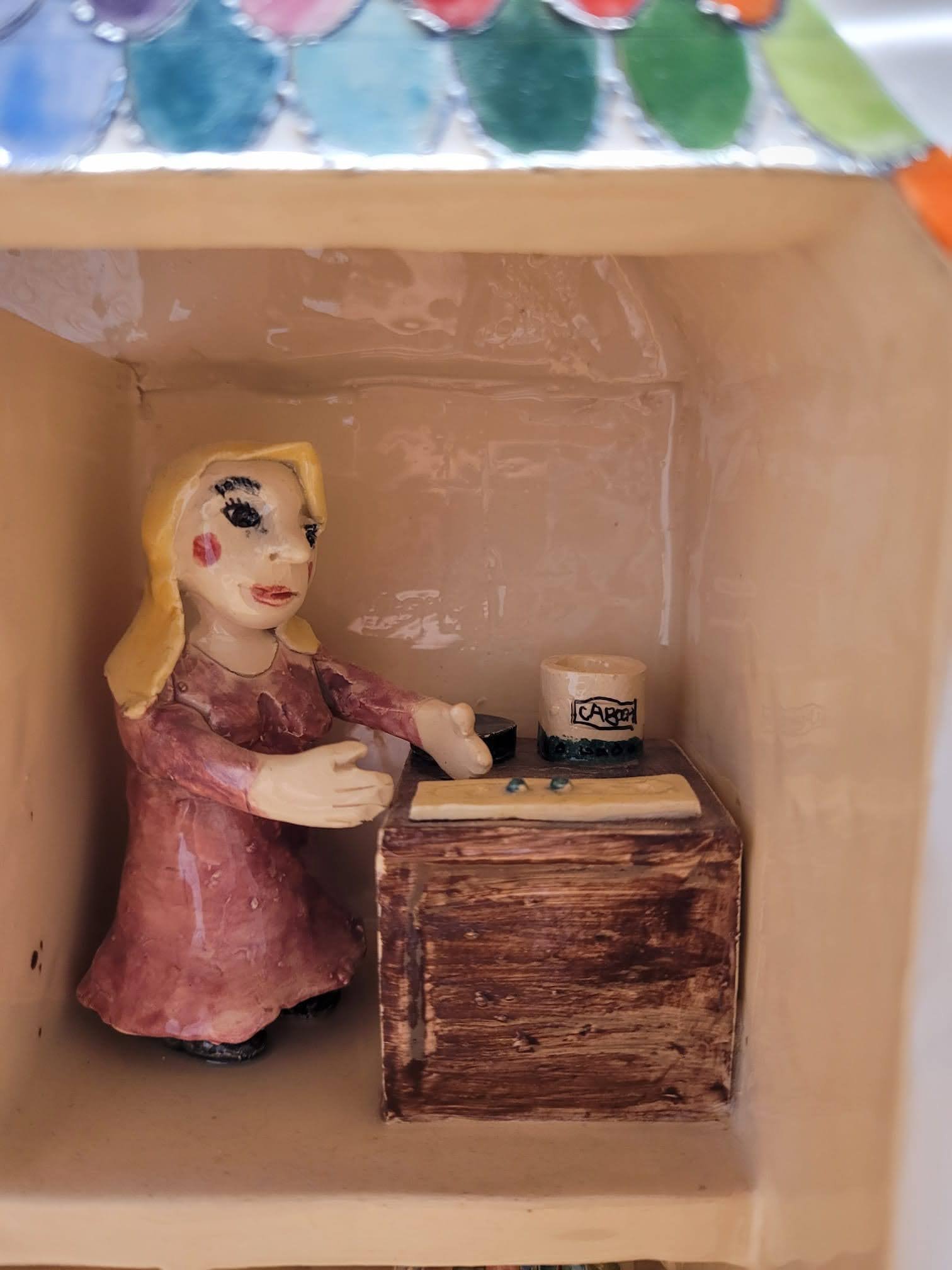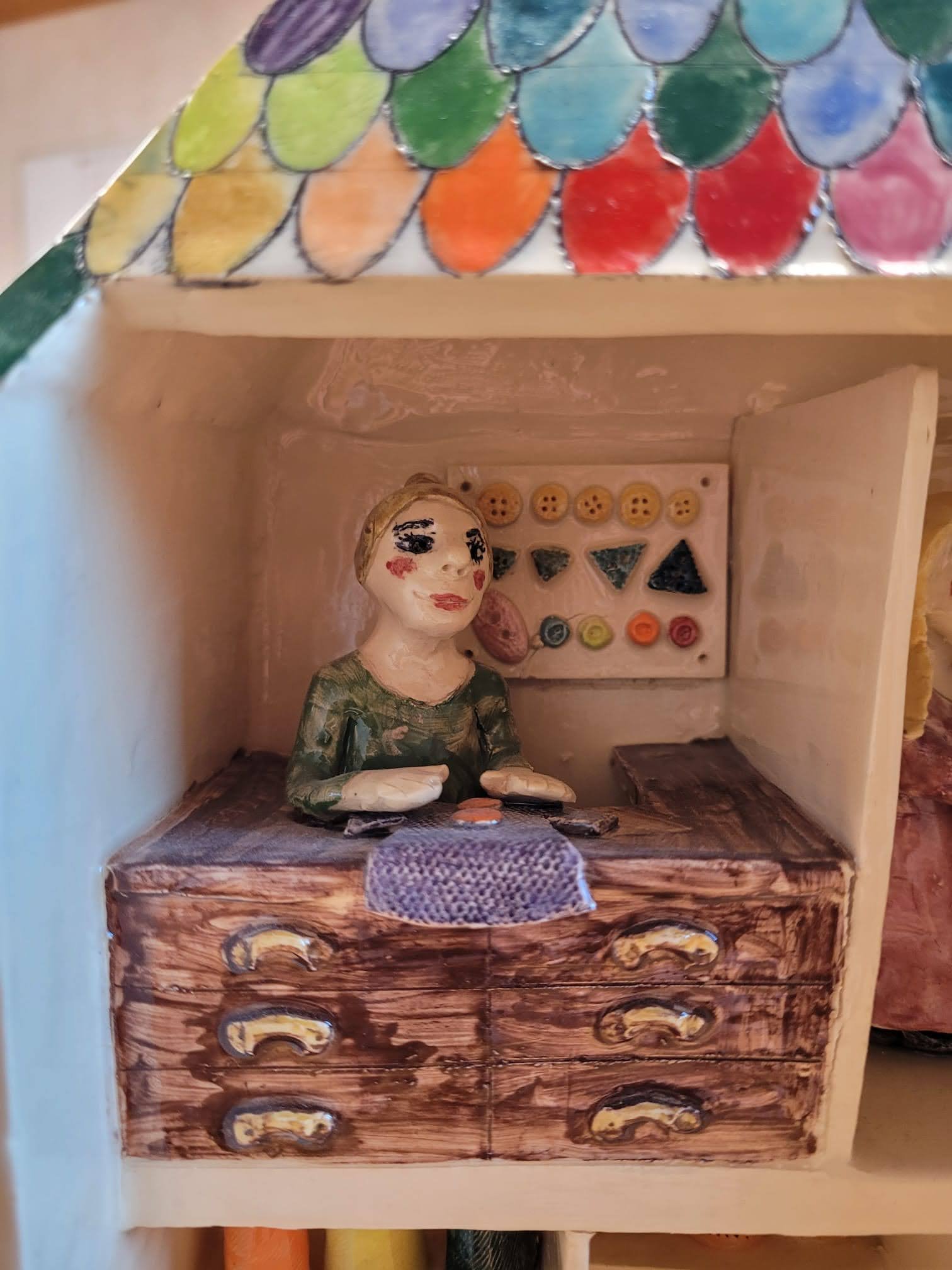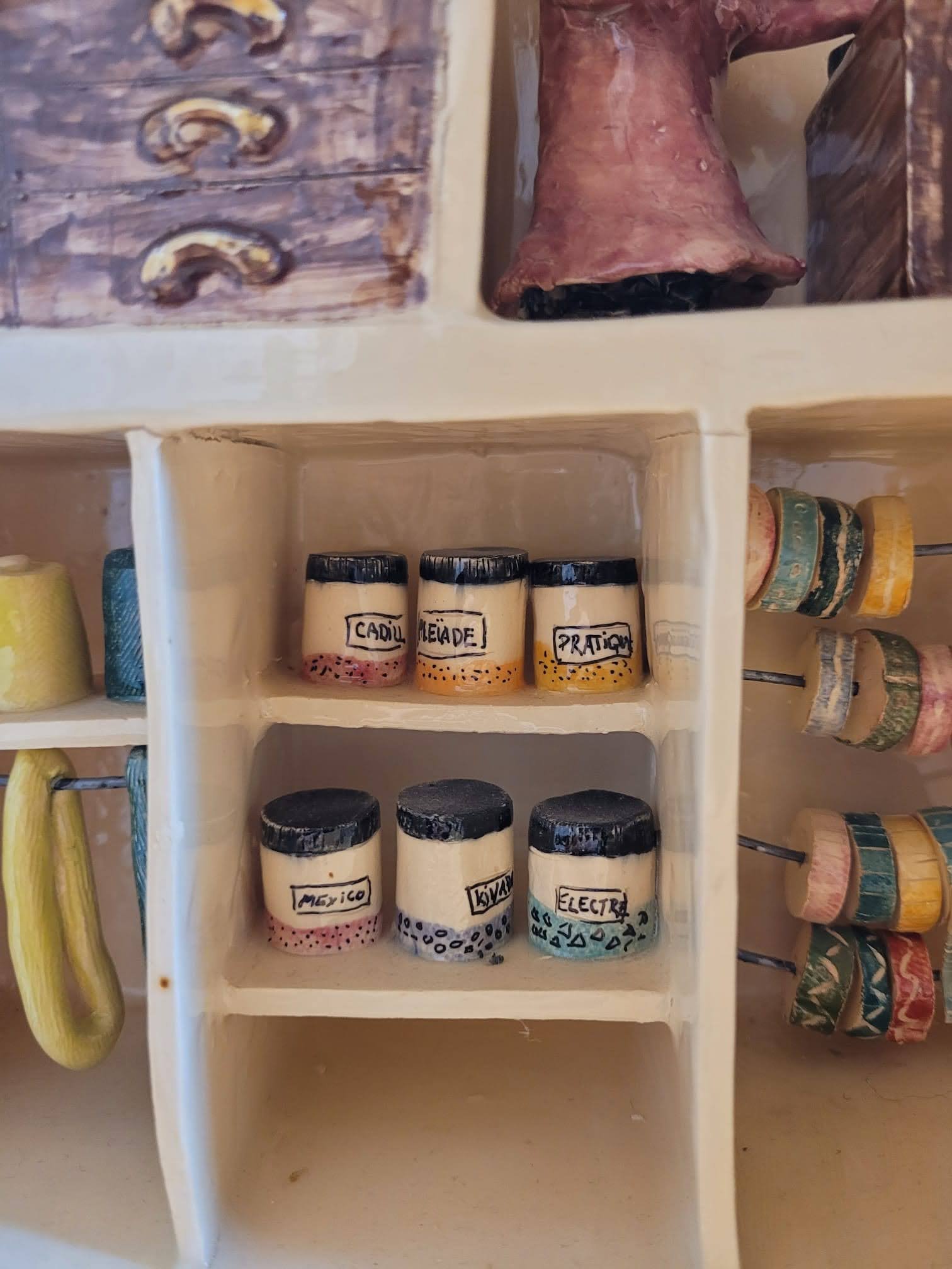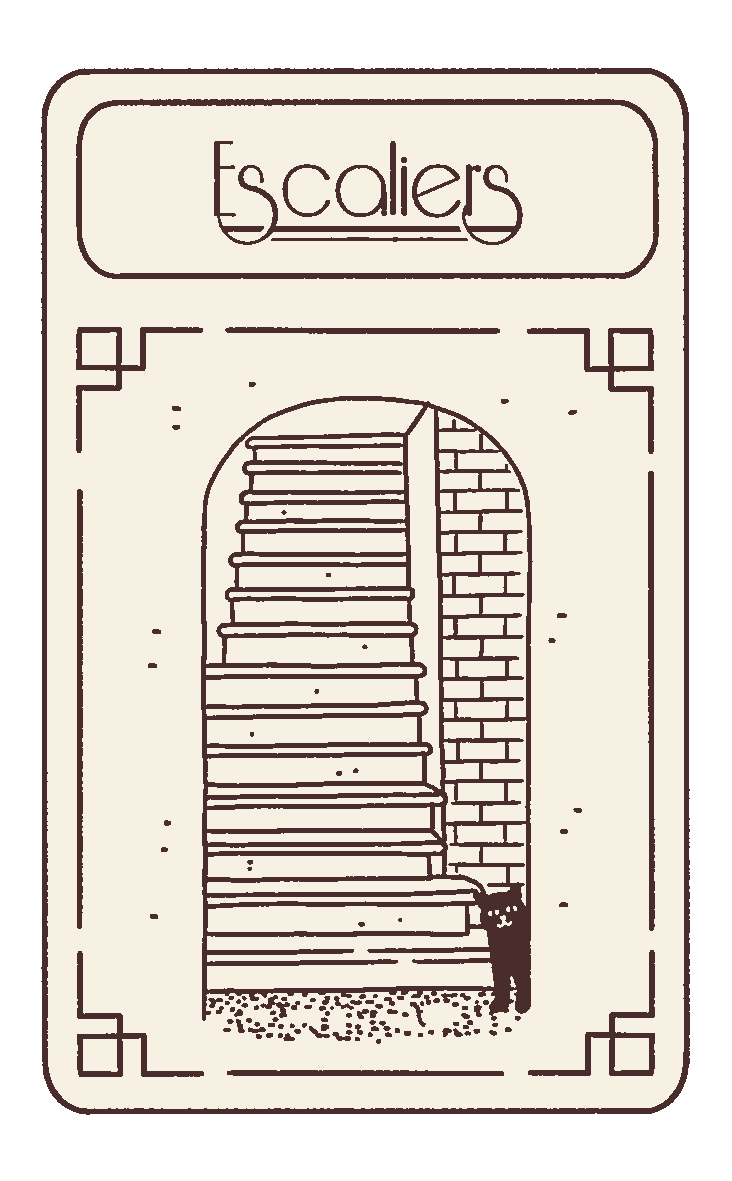 Ce fut donc un vrai travail d’équipe. J’ai retrouvé Suzie et Maëlle de La Droguerie à Paris pour tourner quelques vidéos en vue d’animer le Kal, nous en avons profité pour réfléchir ensemble à des idées de questions rigolotes à vous poser tout au long de l’évènement. Suzie a évoqué l’idée d’un plateau de jeu et m’a montré une petite boutique La Droguerie en céramique réalisée par Amandine, une ancienne Droguette de Nantes. De mon côté j’étais déjà bien emballée par l’ambiance “manoir vu en coupe” de certains plateaux de jeu vintage de Cluedo, alors en rentrant chez moi j’ai fait un croquis d’une espèce de manoir Droguerie reprenant les éléments du Kal Mystère et certaines collaborations Alice Hammer x La Droguerie du passé.