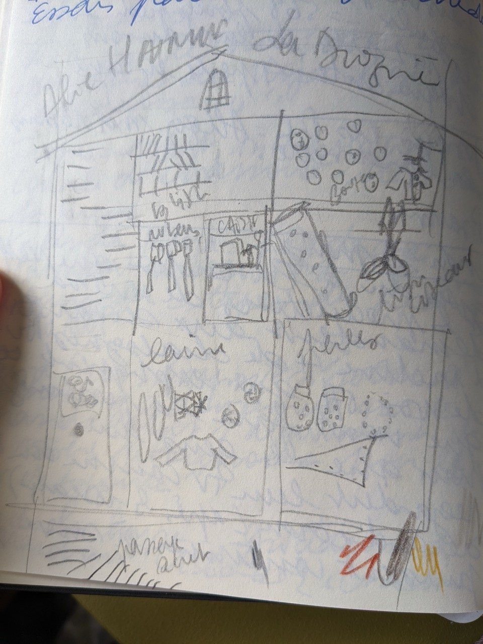 La belle maison d’Amandine, le croquis du croquis, le croquis puis le croquis avec un peu de couleurs et enfin la version d’Arnaud…