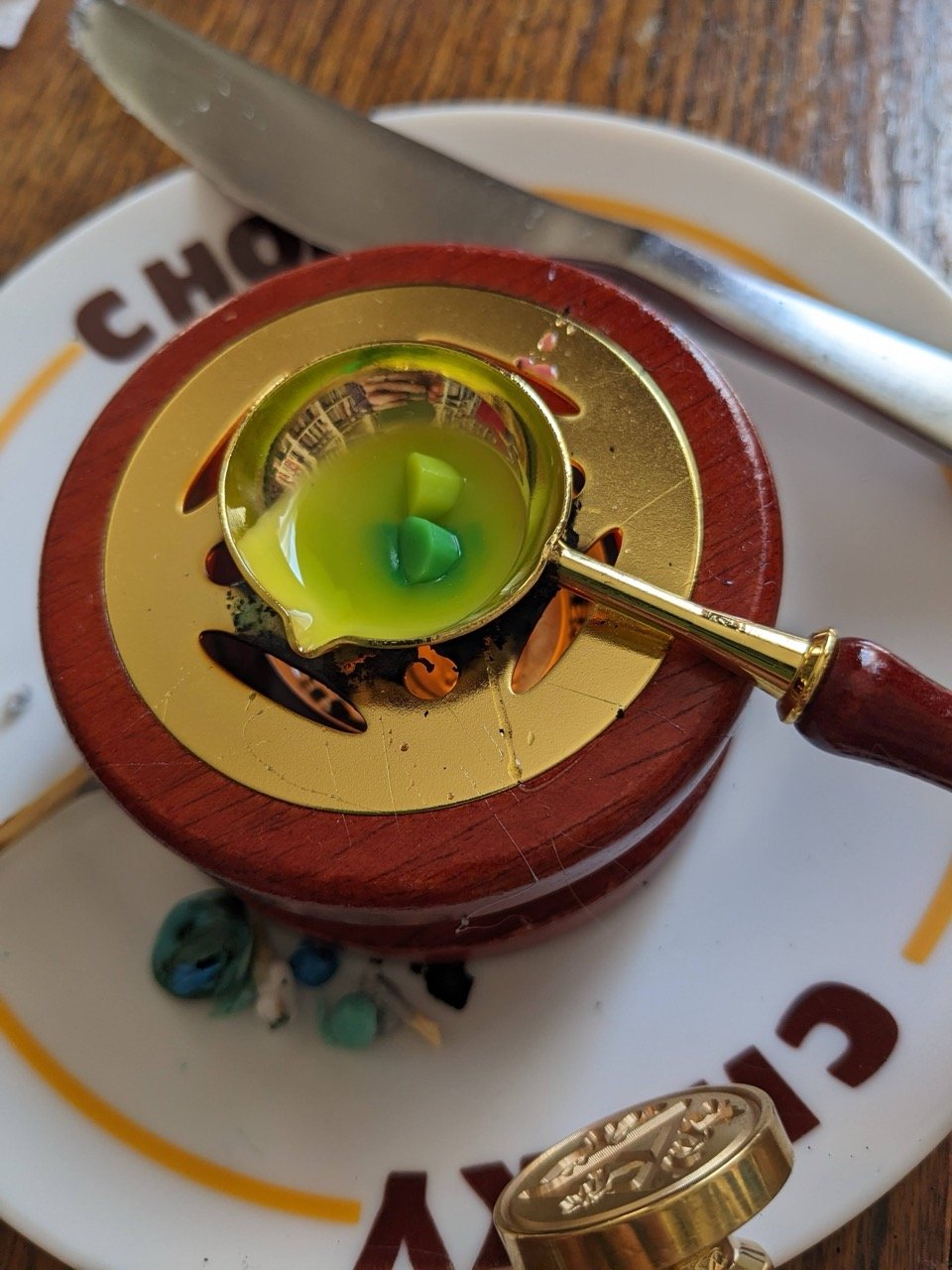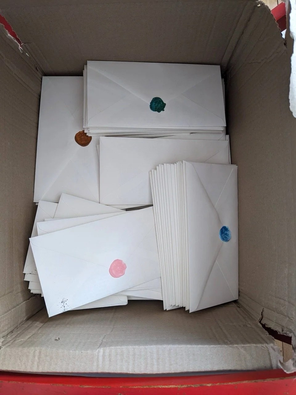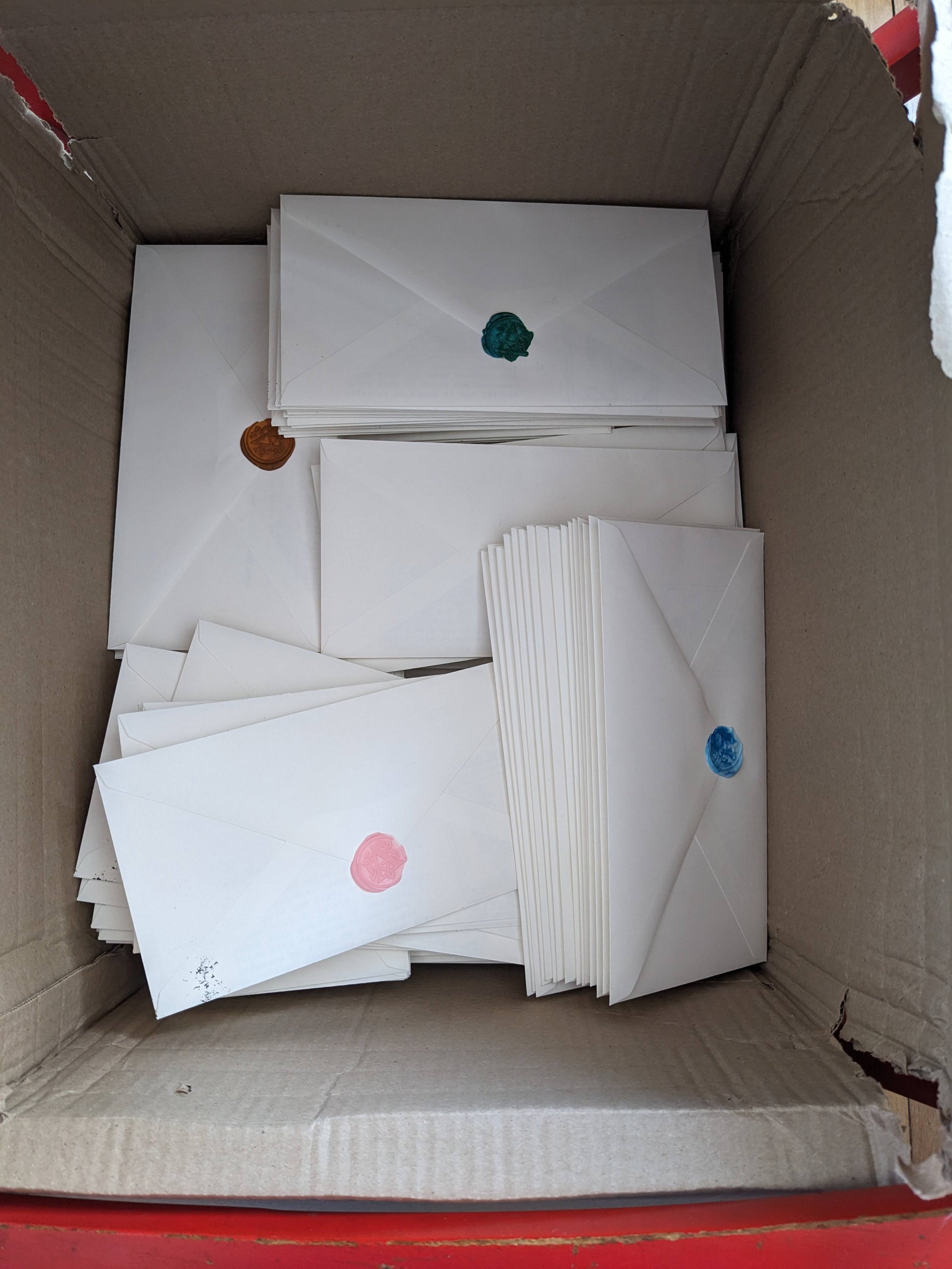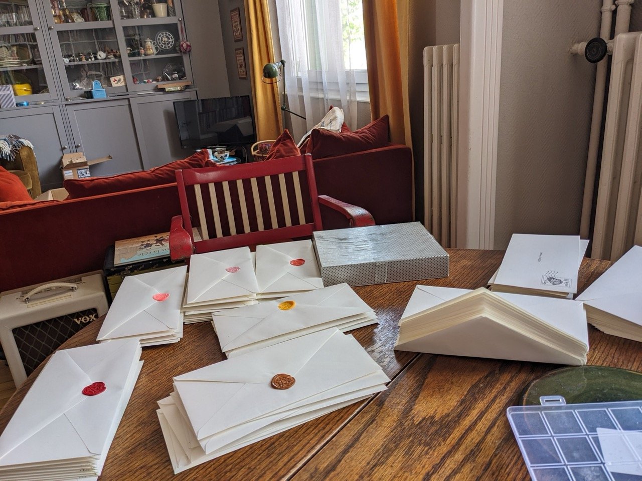Ce fâcheux contretemps s’est donc bien terminé mais a décalé le début du Kal de 3 semaines et je remercie les enquêtrices, qui ont été très compréhensives, pour leur patience. J’ai entre temps préparé les envois, demandé à Arnaud de dessiner des timbres pour l’envoi des codes patron, que nous avons mis sous pli avec l’aide de ma maman. Comme j’aime faire simple, j’ai décidé qu’on allait apposer sur chaque enveloppe des cachets de cire aux couleurs des personnages choisis.