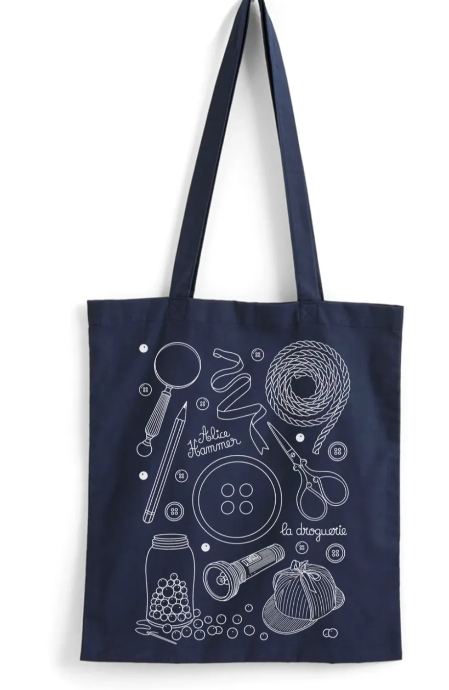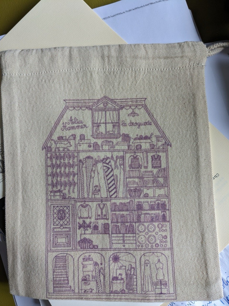 Pour que le Kal soit festif, nous avons décidé de proposer des goodies dans les colis. À la base, les participant(e)s auraient dû recevoir un carnet et un sac à coulisses reprenant l’illustration de la maison pour ranger leur projet, dans 4 gammes de couleurs. Tout ne s’est pas déroulé comme prévu. Les carnets, fabriqués par La Droguerie, étaient nickel mais quand j’ai reçu les sacs à coulisses, catastrophe. Le tissu n’allait pas et tout était mal imprimé, fadasse et de traviole. Impossible pour moi de glisser ça dans vos commandes. J’ai été remboursée par le fournisseur qui a bien admis que les sacs n’étaient pas exploitables mais il a fallu que je trouve en vitesse un nouveau fournisseur. Pour être sûrs que le rendu soit bien nous avons changé notre fusil d’épaule avec Arnaud et opté pour un sac à anses classique, sérigraphié en blanc sur bleu foncé avec des dessins d’indices. Je suis ravie de ce retournement de situation, mon sac ressemble au générique de Thalassa, mon côté nostalgique jubile.