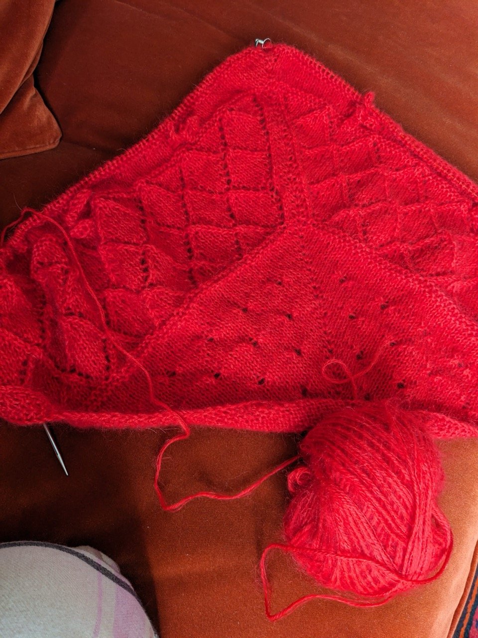 J’ai choisi d’utiliser l’emblématique mélange Alpaga / Plumette qui promet de la douceur mais surtout mon point faible : de la couleur à gogo. C’était parti pour mon prototype en rouge vif Tulipe qui m’a apporté de la lumière au cœur de l’hiver. Quelques semaines plus tard mon châle était terminé et le patron patronné, prêt à être testé par Peggy et Anne.