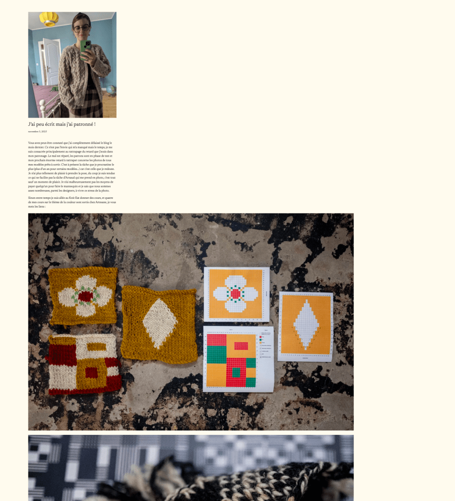J’ai, pour changer un peu, passé du temps dans les coulisses de mon site à chercher des alternatives à Squarespace (la plateforme que j’utilise) qui me fait des crasses depuis un an. Les crasses en question m’ont coûté cher une fois additionnées, notamment l’an dernier quand mon site a été utilisé pour du test de cartes bleues volées ou encore cette année quand la plateforme du paiement s’est mise à refuser les renouvellements d’abonnement du Club Tricot. Les spécialistes Squarespace m’ont bien fait relire les condition générales de vente qui stipulent, évidemment, qu’en cas de défaillance de leur part, rien n’est prévu pour indemniser ni faire un geste commercial. Je suis donc à la recherche d’alternatives et ça ne me fait pas du tout peur de déménager ma boutique mais ce qui coince, c’est le blog. Déménager un blog actif depuis 13 ans, c’est une tannée. On peut l’exporter mais quand on l’importe sur une autre plateforme, la mise en page est tellement modifiée qu’il devient illisible. Les blocs textes sont tout petits, les images immenses, et il faudrait tout refaire à la main, article après article ce qui représenterait je pense des mois de travail. Voici un exemple sur WordPress (j’ai dézoomé la fenêtre pour que vous voyiez).