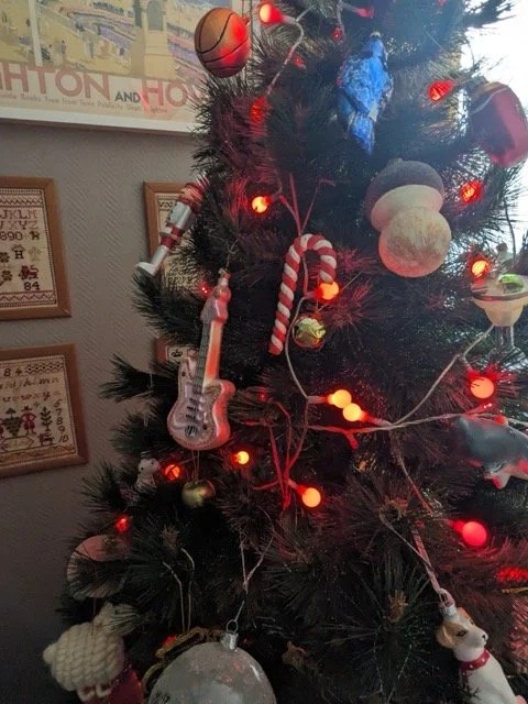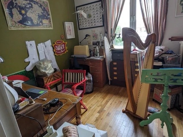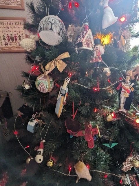 À la maison on a fait le sapin et chaque année j’ai l’impression de rouvrir la malle aux trésors en retrouvant les décorations. J’aimerais que ce temps des fêtes dure plus longtemps même si je ne vous cache pas que je suis toujours un peu soulagée de remballer en janvier car qui dit sapin dit déménagement de la harpe dans mon bureau qui me sert aussi d’atelier de couture, autre activité qui prend de la place, je dois me faire petite souris dans ma pièce tout le mois de décembre.