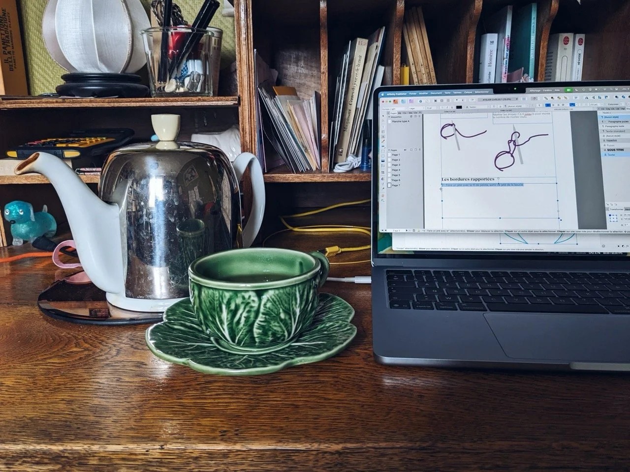 Le seul « hic » c’est que je trouve qu’il est un peu gros (j’ai choisi le 13 pouces qui est aussi grand que mon ordinateur) à transporter dans le sac à tricot. Je pense que j’ai tout de même bien fait de prendre le grand modèle, pour dessiner et faire mes tableaux je suis très à l’aise et je pense qu’on est vite limité avec le 11 pouces. C’est mieux aussi pour lire les partitions (il y a de supers applis pour ça), moi qui suis un peu bigleuse j’apprécie beaucoup de lire la musique sur l’écran rétro-éclairé c’est un vrai confort. Et en toute honnêteté, je ne sors pas beaucoup de chez moi…