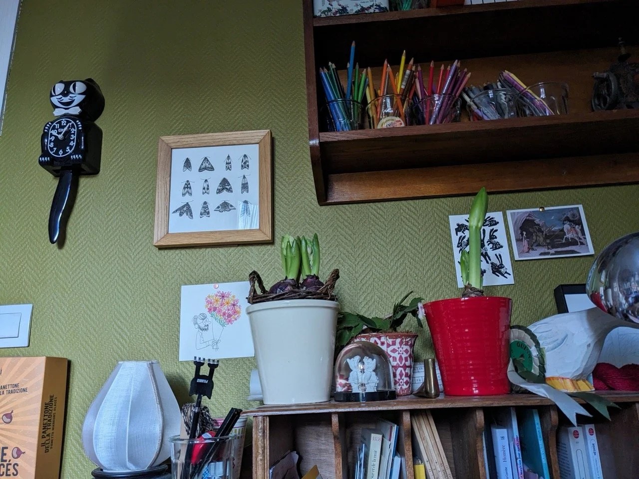 Autre nouveauté, Arnaud m’a offert pour mon anniversaire une Kit Cat Clock qui a pris place au-dessus de mon bureau. Ça me fait un compagnon chat… un peu bruyant. J’ai eu peur que ça me rende zinzin (j’ai une très faible tolérance au bruit, je peux devenir folle avec un frigo qui ronfle ou une prise qui siffle et en plus j’ai tendance à compter quand il y a un bruit régulier) et en fait c’est tout le contraire, quand je rentre dans ma pièce le tic tac du balancement de la queue me met tout de suite dans un état de concentration et m’isole, c’est le bruit de mon antre.