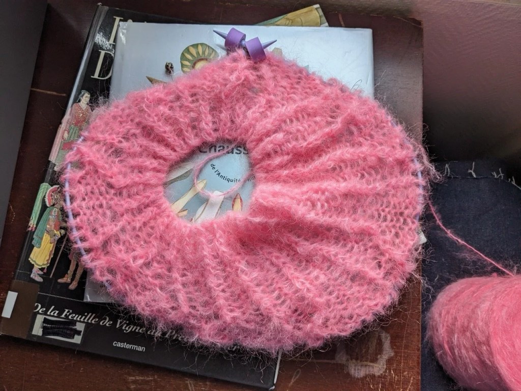 J’ai monté un pull avec un cône de Kid Mohair rose de La Droguerie qui traine sur mon bureau depuis le Knit Eat. C’est un petit projet rapide (je tricote avec des aiguilles de 9mm) pour prendre de l’élan avant un plus gros projet.