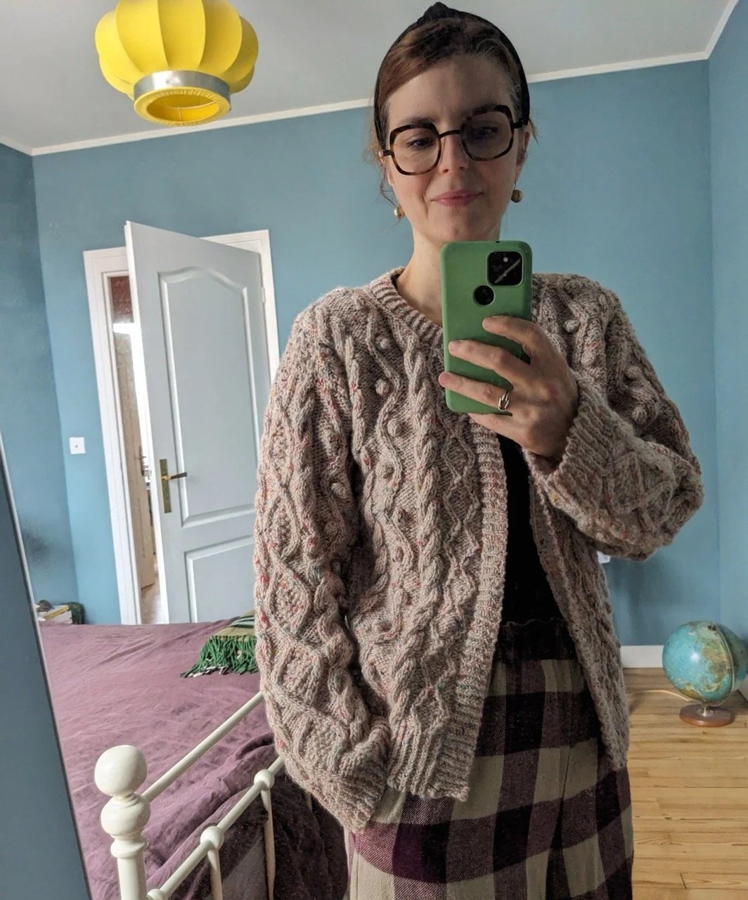 J’ai terminé le patron de la veste qui s’appellera Adèle que je vous ai montrée il y a un moment déjà et qui a été un sacré morceau, rapport aux grilles. Un appel à test est à prévoir sous peu.