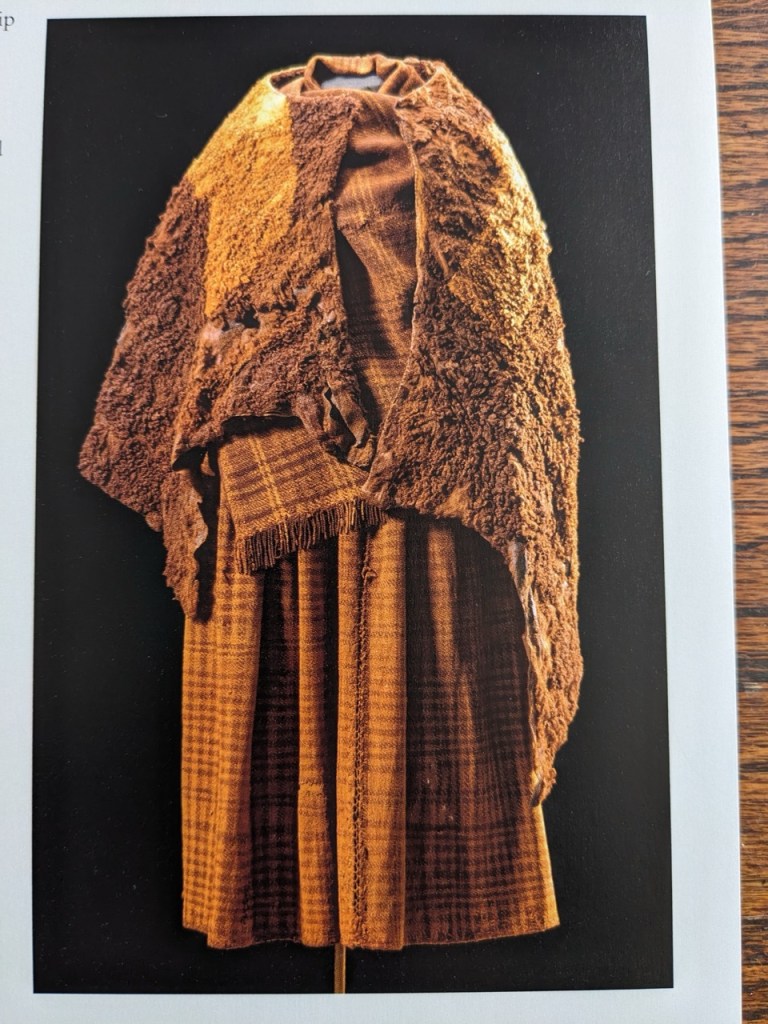 En tant que fan de tartan et de carreaux de tous poils je ne peux qu’être émue. Tout est brun orangé à cause des tanins contenus dans la tourbe (ce sont ces mêmes tanins qui, tannant tout ce qui contient de la kératine, donc peau, ongles et laine, garantissent cette superbe conservation) mais après analyse des fibres, on a retrouvé les couleurs d’origine et une simulation a été créee pour le livre :