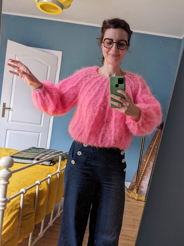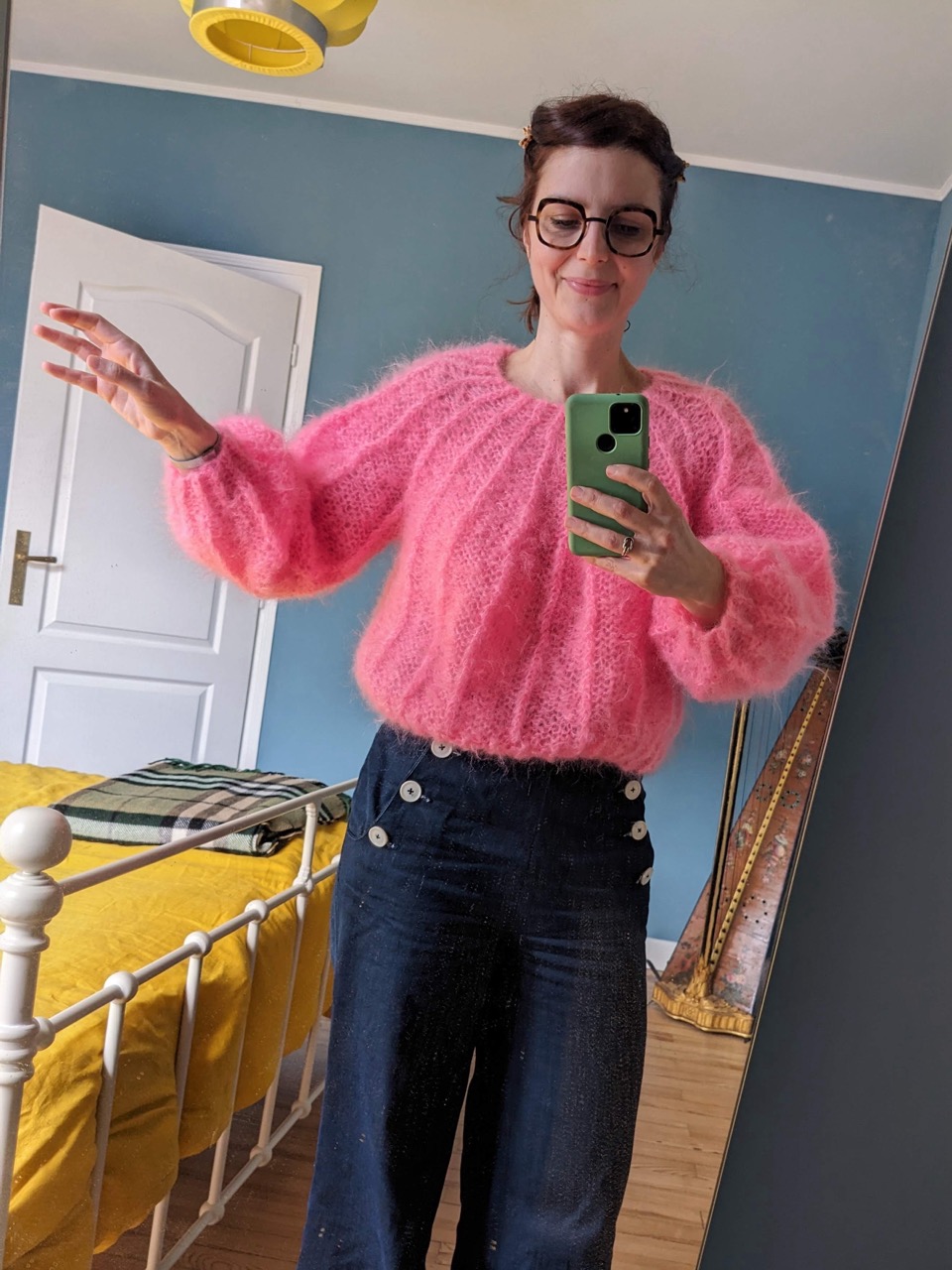 La parenthèse informatique de la semaine se referme, revenons au tricot, j’ai fini mon pull rose et je ressemble à une grosse barbe-à-papa (ou à Barbapapa, on ne saurait dire) mais je suis contente et ce rose a réjouit toute la maisonnée le temps de la confection du pull. Même Minou était en joie, mais je crois c’est plus le mohair qui le rend un peu zinzin.