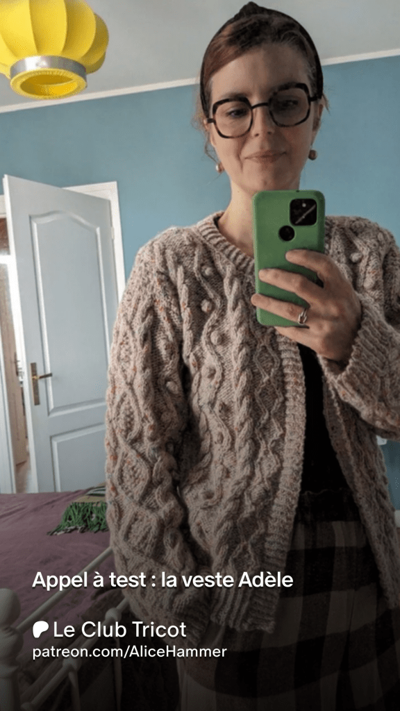 J’ai lancé l’appel à test pour la veste Adèle, mes abonnées Patreon ont eu la primeur de l’annonce mardi (je leur laisse toujours la priorité pour se positionner sur les tests) et j’ouvre aujourd’hui l’appel à toutes les bonnes volontés aimant particulièrement les torsades. Voici le lien vers la publication, vous pouvez si vous le souhaitez vous proposer remplir le petit formulaire en bas de page.