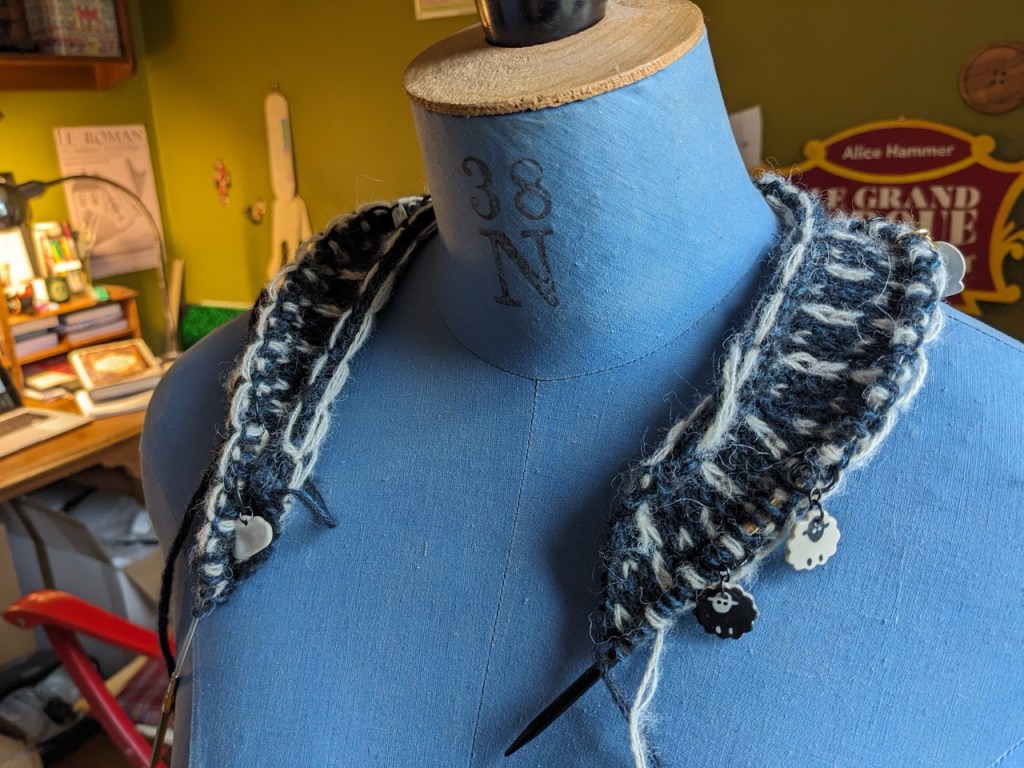 J’ai tout juste commencé un nouveau ouvrage, avec de la laine qui trainait dans un sac accroché à la poignée de porte de mon bureau et sur laquelle je louchais depuis un moment, son temps est enfin venu. J’ai démarré un pull / blouse en jacquard que je tricote avec un mélange de Bio Shetland et de Svala. C’est un tout petit démarrage, je ne vous donne pas encore de quoi vous rincer l’œil. C’est un projet à 4 pelotes absolument pas « voyage à Paris compatible » mais que voulez-vous, je ne voyage jamais léger et de toute façon dans le train j’ai en général trop mal au cœur pour tricoter…