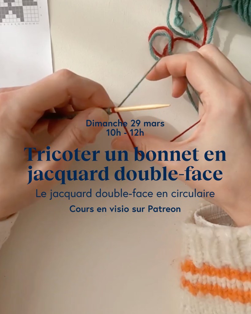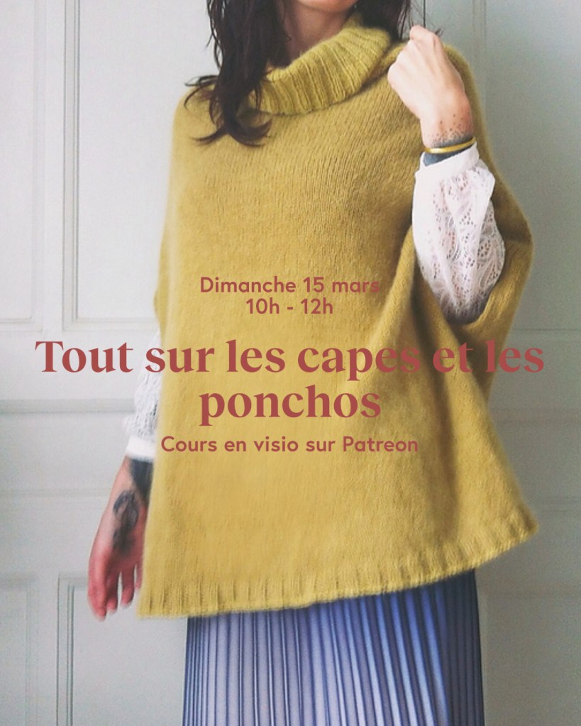 J’ai programmé les cours du mois de mars, au programme des prochaines semaines « Tout sur les capes et les ponchos », « Bibliotricot 2 » et « Le jacquard double-face en rond ». Toutes les informations sont ici et même les non abonné(e)s Patreon peuvent s’inscrire et participer :