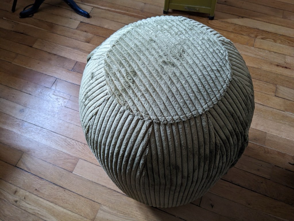 Je vous écris en équilibre sur mon ballon : j’ai le dos et les hanches en vrac, j’ai dû prendre des mesures ergonomiques et j’ai offert à mon séant une bulle de malabar en velours olive reçue et gonflée mercredi. C’est très bizarre, c’est pas inconfortable mais je cherche encore ma place sur ce truc et il va falloir que je vide le dessous de mon bureau que la décence m’interdit de vous montrer car je ne sais plus où mettre mes pieds maintenant que je ne peux plus me plier en 12. J’ai pourtant pris le modèle gain de place qui a plus la forme d’une gélule que d’une sphère. Il va falloir envisager, de toute façon, un grand rangement de la pièce bureau, j’ai repris la couture et j’ai perdu le contrôle de la situation.