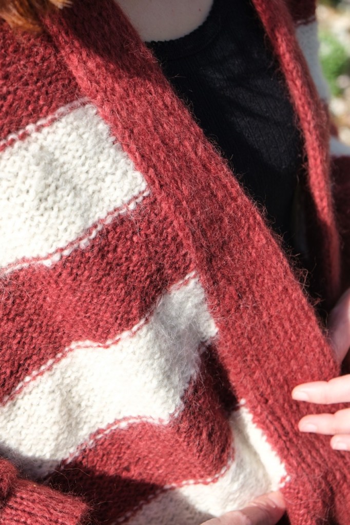 Elle se tricote en top-down et tout l’empiècement est construit grâce à la méthode contigüe (si vous ne connaissez pas : ce n’est rien de plus compliqué qu’un jeu d’augmentations pour créer la ligne d’épaules). Pour obtenir un beau tombé, le bas des manches et du corps sont ourlés. Et pour un maximum de douceur autour du cou, toute la bande de boutonnage (je ne suis pas sûre du mot dans la mesure où il n’y a ni boutons ni boutonnière…) est tricotée en double-face.