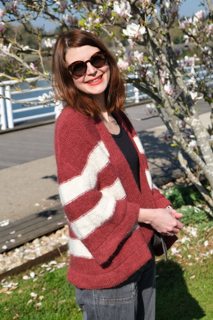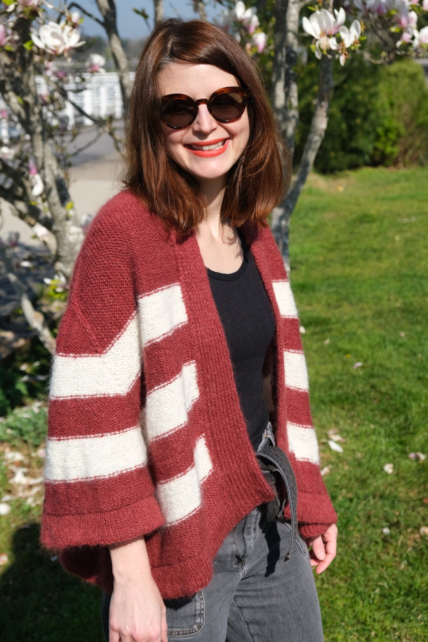 Quand j’ai touché le fil Saperlipopette j’ai tout de suite voulu me tricoter une veste à porter tout le temps et sur tout, directement inspirée de ma robe de chambre la plus douillette. Car certes, travaillant à la maison et ayant des loisirs d’intérieur, je sors peu de chez moi mais j’aime hiberner avec chic.