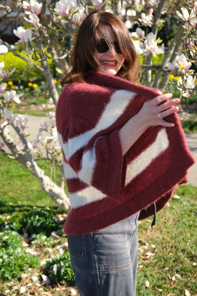 Concernant le fil : j’ai utilisé la Saperlipopette de chez Fonty que j’ai tricotée en double avec des aiguilles de 5 mm. C’est un mélange Baby Suri alpaga, soie et mérinos, inutile donc de préciser que ça ne pique pas (comme on me pose souvent la question…).